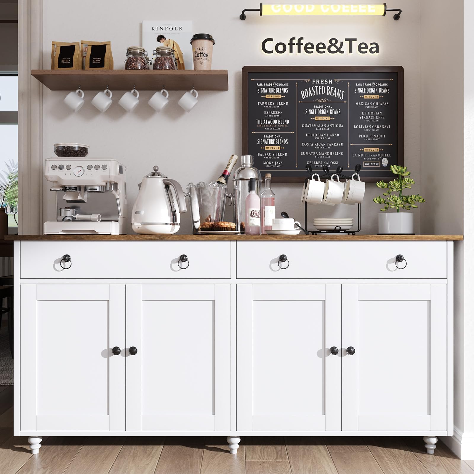 • Large Storage Space: Coffee bar cabinet with adjustable shelves on both sides for flexible storage of various household items, two drawers to keep other kitchen clutter in order, spacious tabletop place a coffee pot or microwave oven