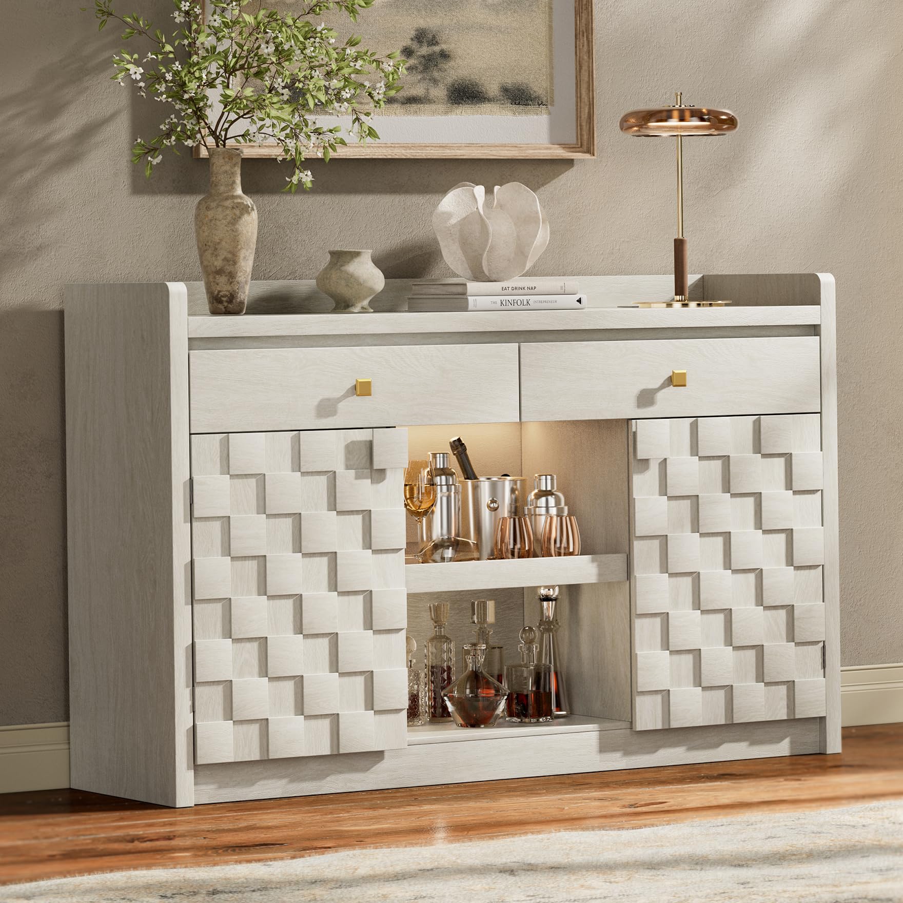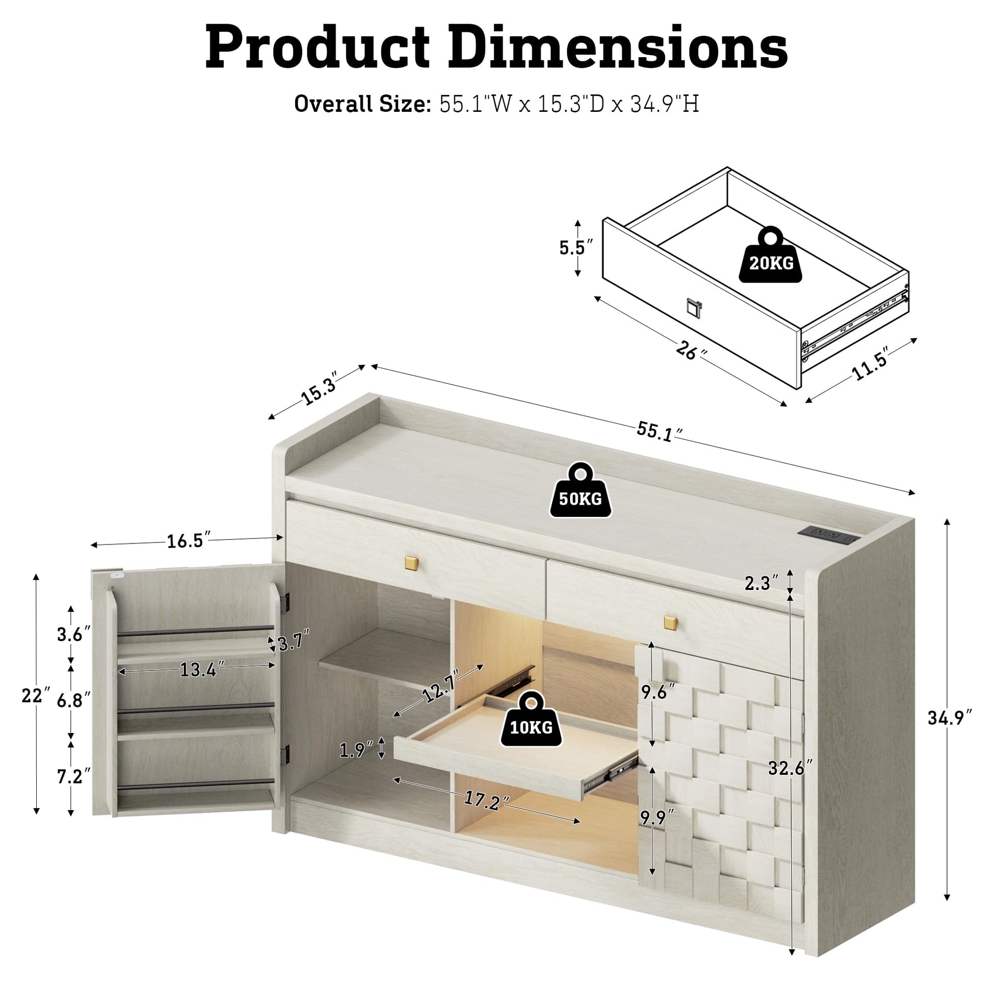 55" Fluted Sideboard Buffet Cabinet with Charging Station and LED Light, 2 Drawers, Pull-Out Shelf, and Spice Rack, Modern Kitchen Storage, White Oak