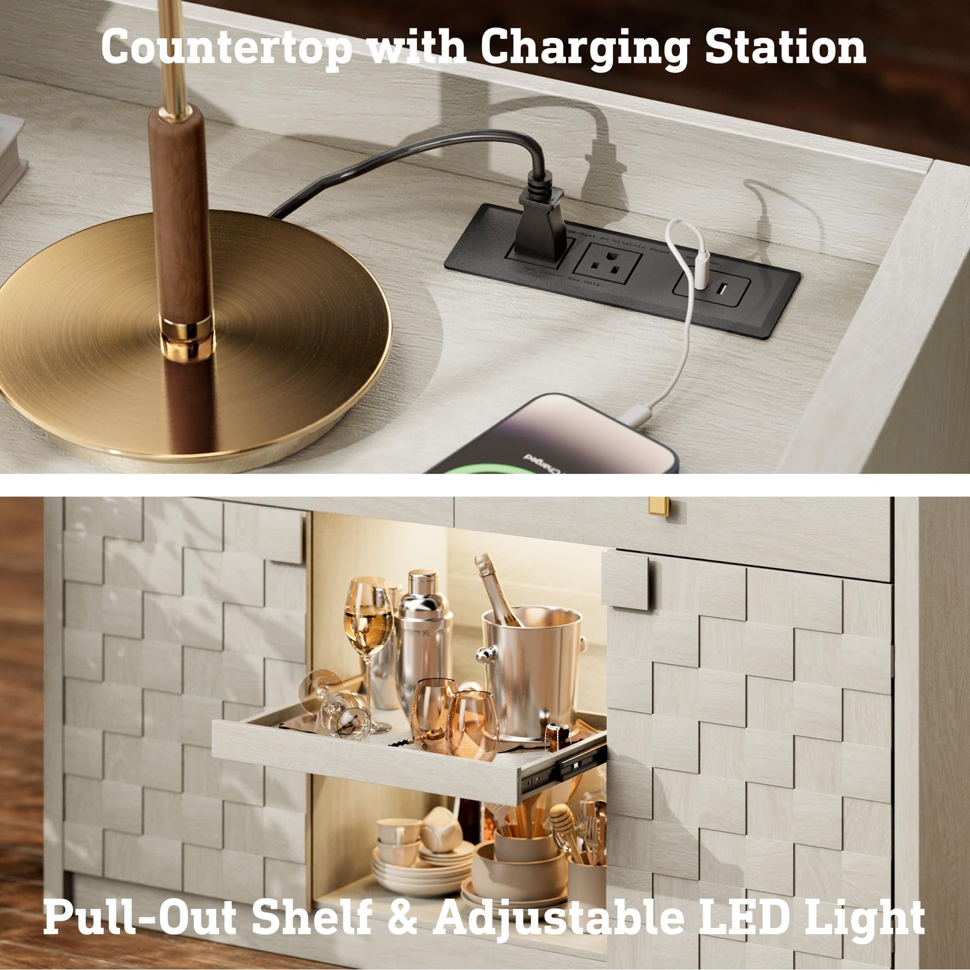 - Charging Station & LED Light: This sideboard buffet cabinet with 2 AC outlets and 2 USB ports, so you can easily plug in small kitchen appliances. The sideboard cabinet features a 3-color adjustable LED light strip to create the perfect ambiance and make it easy to see and access your stored items.
