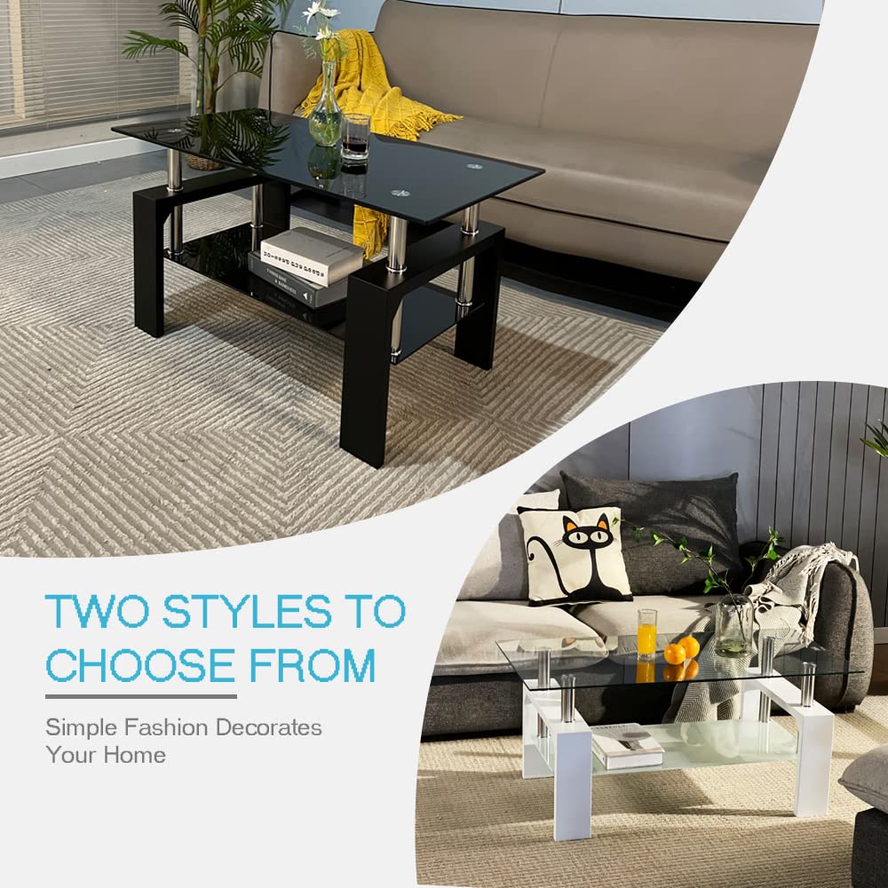 Btrpily Modern Rectangle Coffee Table for Living Room, 39.5D x 23.5W x 17.5H in, Black Glass Tea Table with Wooden Legs & Lower Storage Shelf, Stylish Center Table for Home or Waiting Room