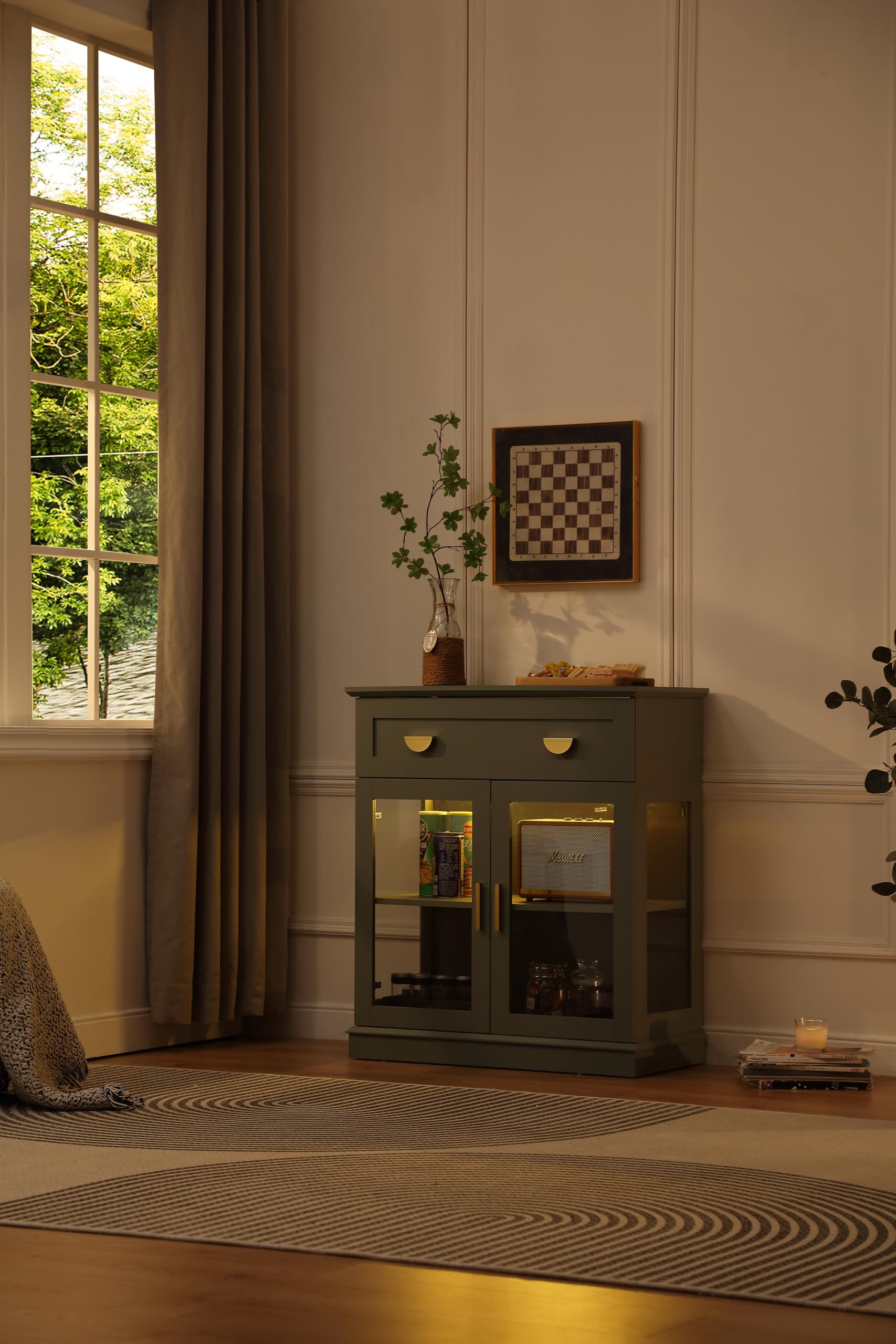 **31.5'' Small Buffet Cabinet with Glass Doors, Compact Coffee Bar Cabinet with Storage, Modern Sideboard Buffet with Adjustable Shelf and Drawer for Kitchen, Dining Room, and Living Room, Green**