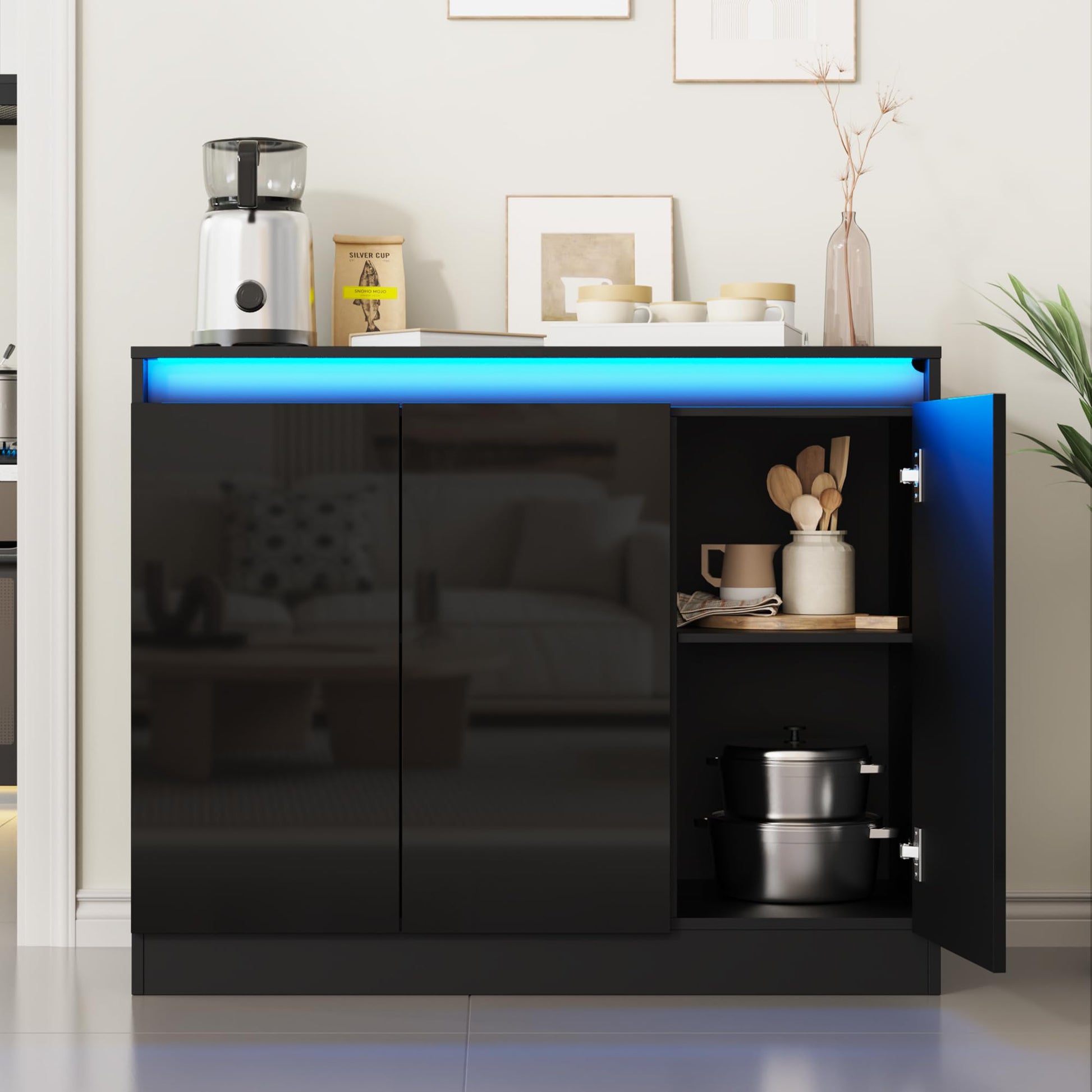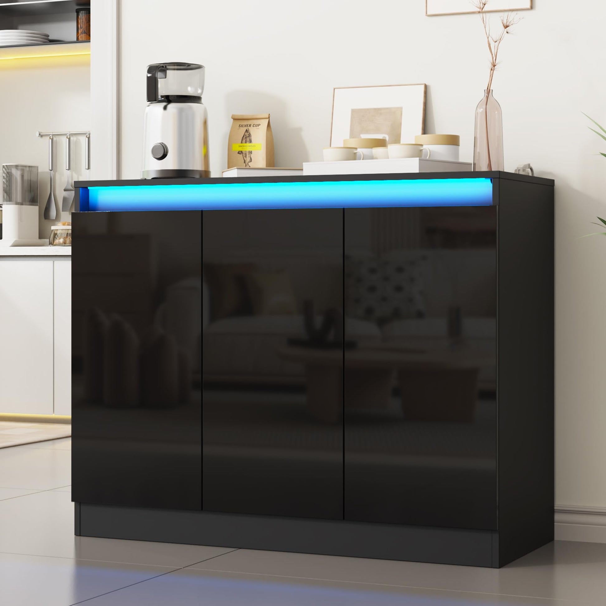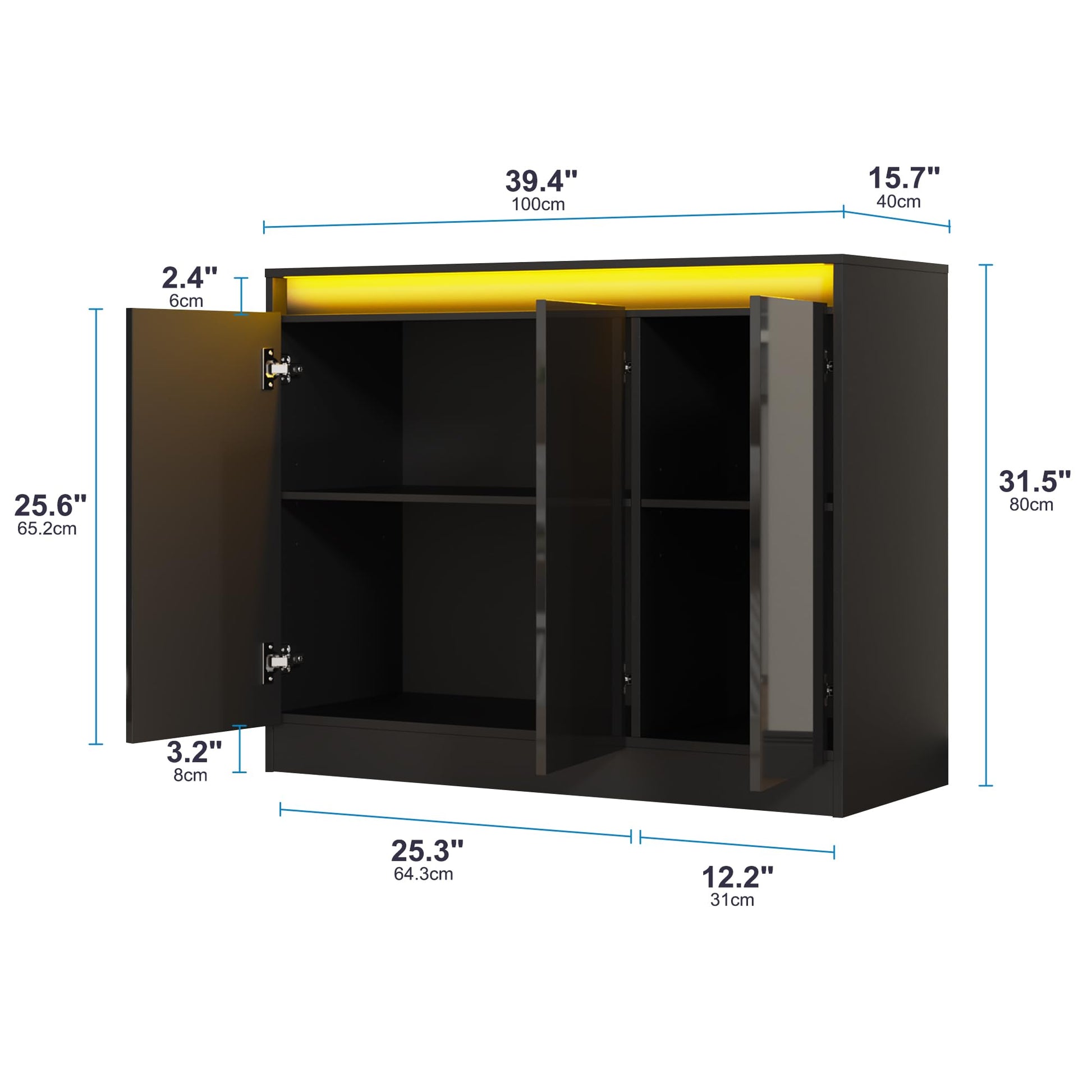 - 【LED Lights Cabinet with Charging Station】- This storage cabinet features 3 high-gloss doors and includes an advanced adjustable LED lighting system—complete with integrated light strips. With customizable colors and multiple dynamic modes, you can effortlessly set the perfect mood for any occasion, whether it's an intimate dinner, a lively gathering, or a relaxing evening. Control the ambiance with ease using the included remote or a convenient smartphone app, transforming your kitchen or dining space into an immersive experience. This functional cabinet features a built-in charging station with 2 AC outlets and 2 USB ports, conveniently powering multiple devices
