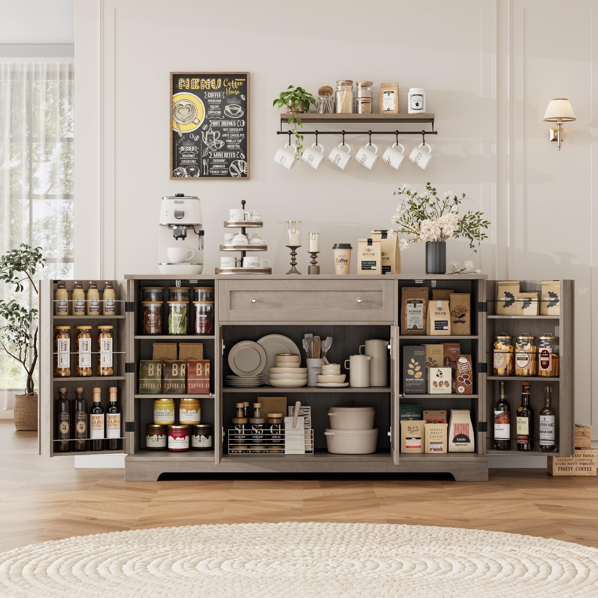 • Ample Storage Space: The buffet cabinet offers an efficient storage solution with wide tabletop, a handy drawer, bottom large cabinet as well as two side doors each with three storage shelvings, which keeps your kitchen well organized while bringing some style