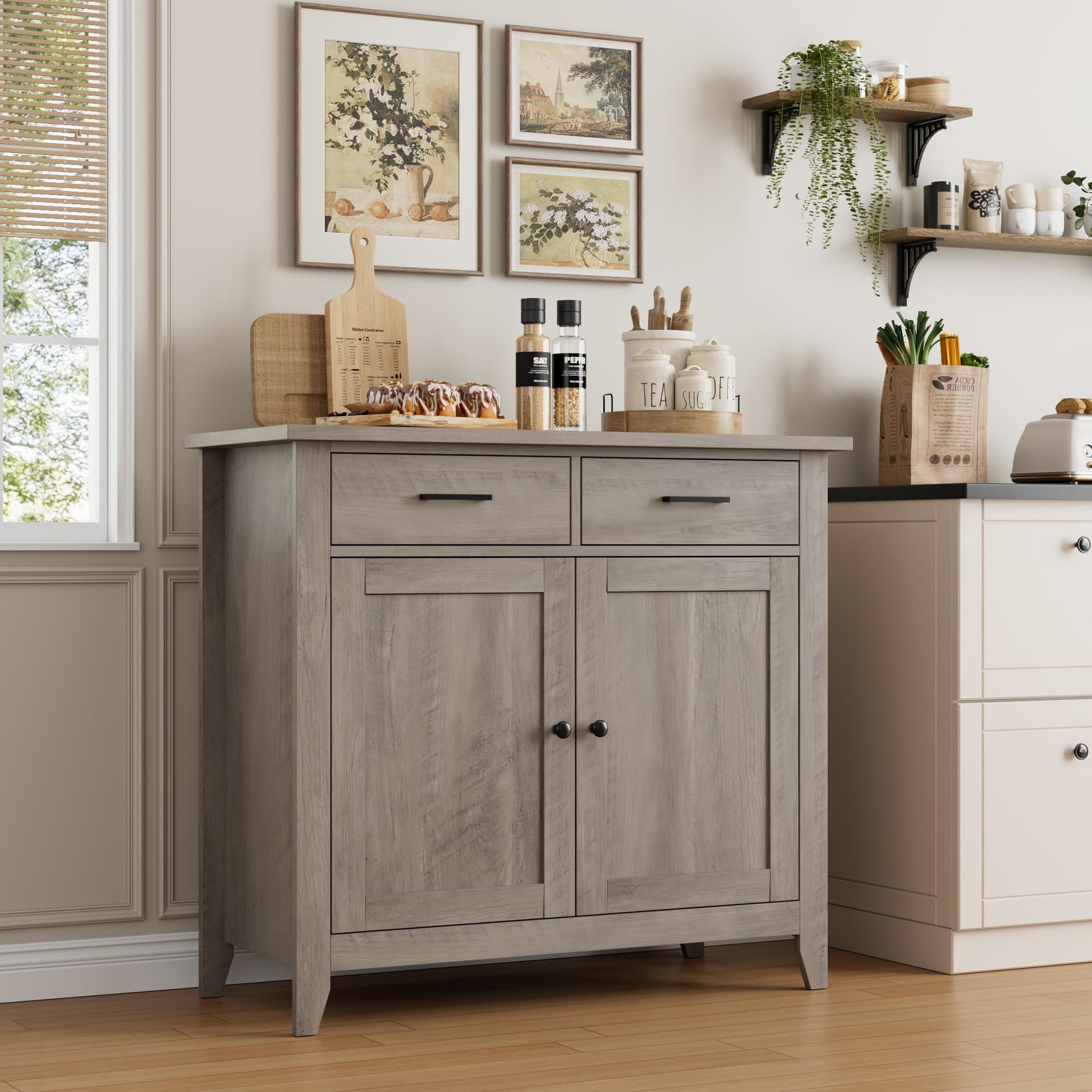 HORSTORS Modern Farmhouse Buffet Cabinet with Storage, Kitchen Sideboard Coffee Bar with 2 Drawers and 2 Doors, Floor Storage Cabinet for Living Room, Dining Room, or Bathroom, Grey