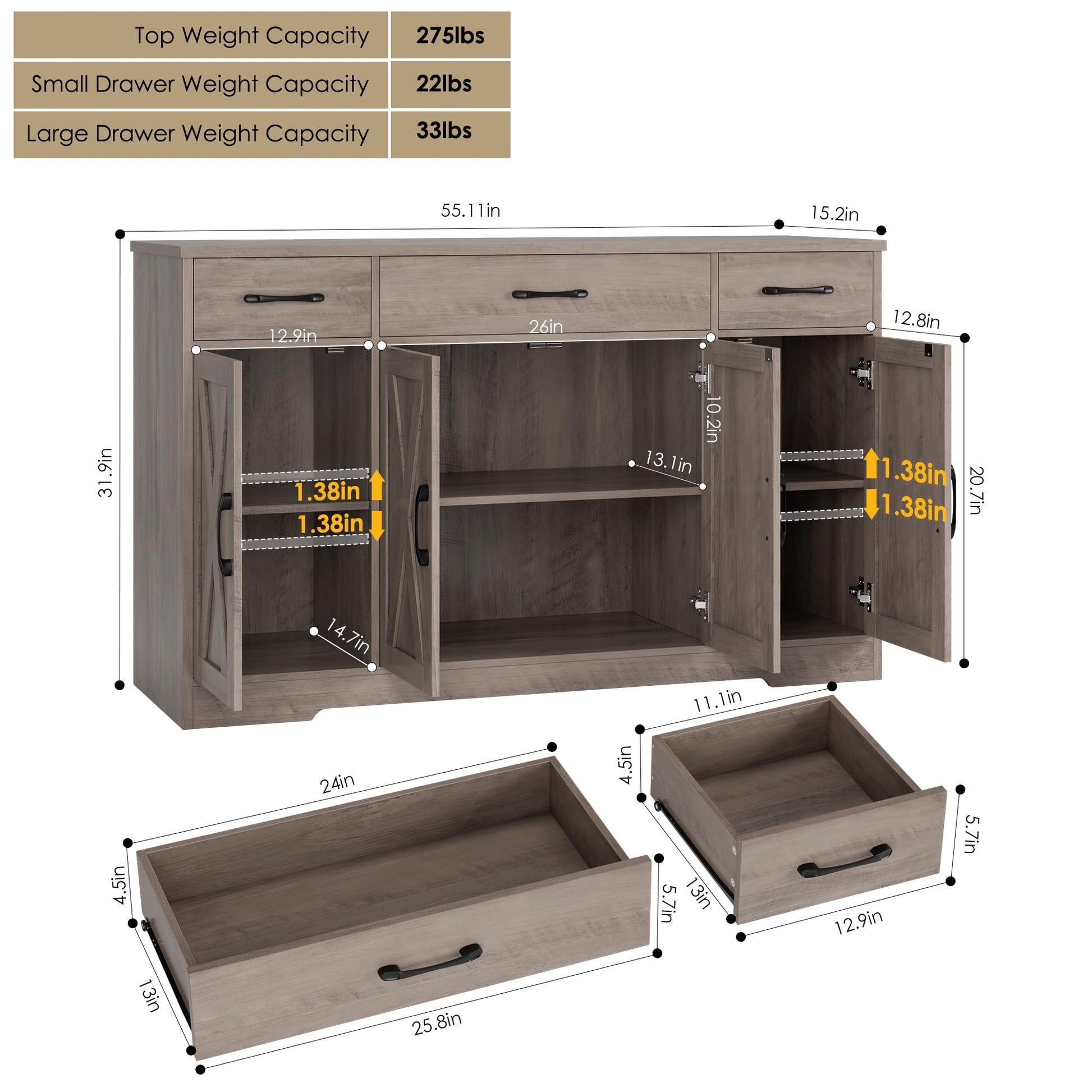 - Crafted to Last: Made of high-quality manufactured wood and smooth-gliding rails in exquisite workmanship, this kitchen buffet with drawers boasts reliable stability and durability to withstand everyday use. Overall size: 15.1"D x 55"W x 31.9"H. Weight Capacity: 300 lbs