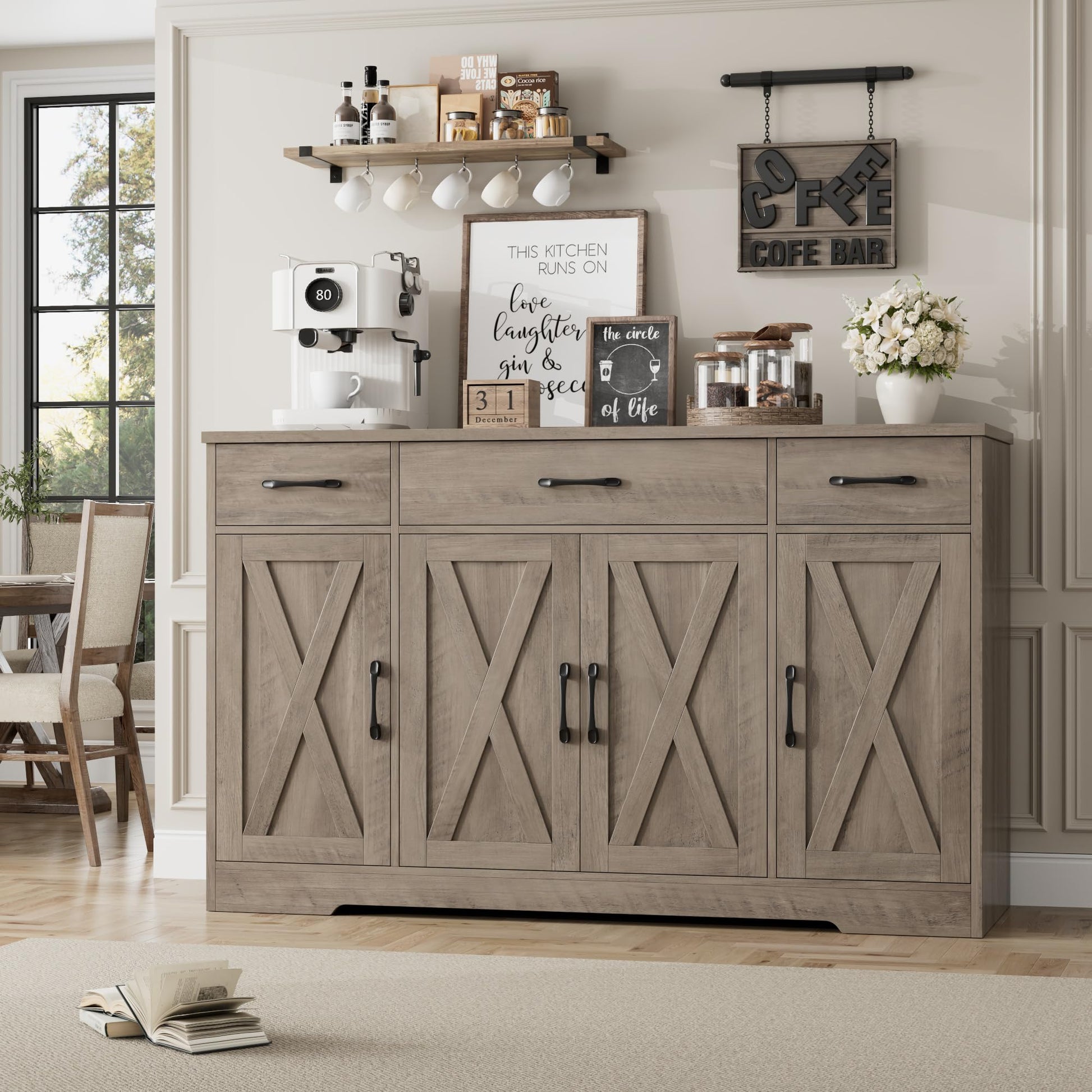 - Modern Farmhouse Flair: The farmhouse coffee bar is completed with classic rustic elements like X trim doors, black metal handles and finish in two contrast colors, which is steeped in a rich rustic flair and looks right at most country, cottage or coastal abode