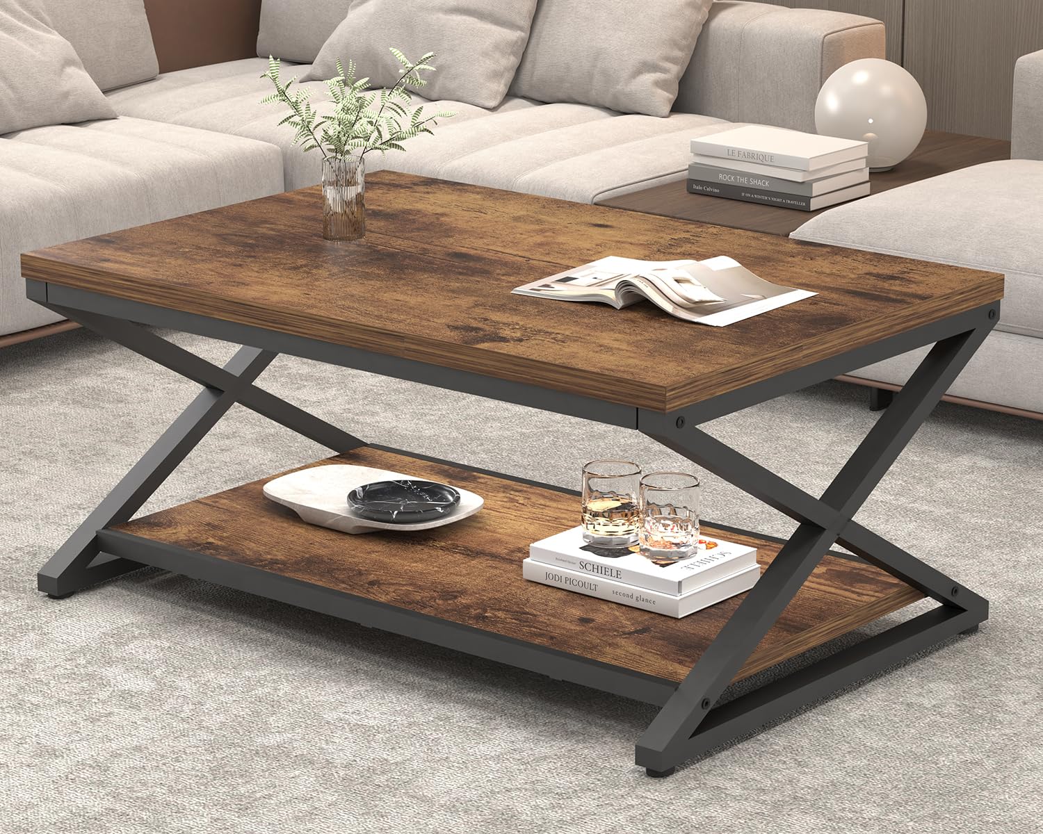 - 【Sturdy and Durable Structure】: Made of High-quality engineered wood table top and X-shaped frame, this industrial metal wood coffee table is incredibly durable, and the weight capacity is up to 300 LBS. This rustic brown coffee table is also equipped with adjustable feet, providing stability on uneven surfaces and protecting floors from scratches.