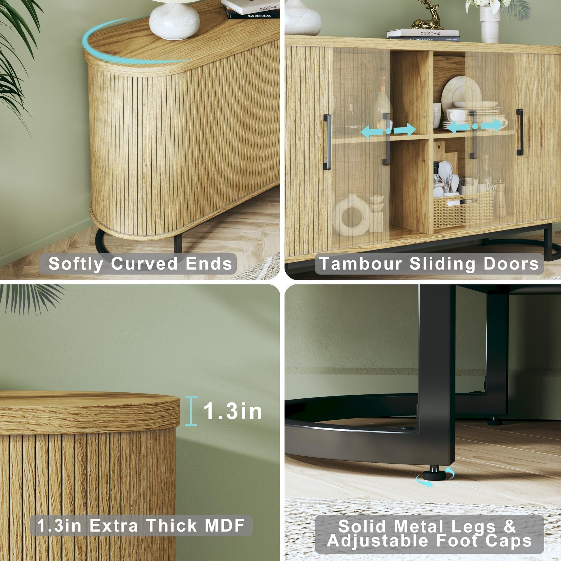 - Sideboard Cabinet with Tambour: The buffet cabinet’s curved edges and sleek tambour doors add a touch of elegance to any space. The oak grain finish offers a natural, inviting look that complements a variety of interior styles, making it a versatile choice for the kitchen, dining room, living room, or entryway.