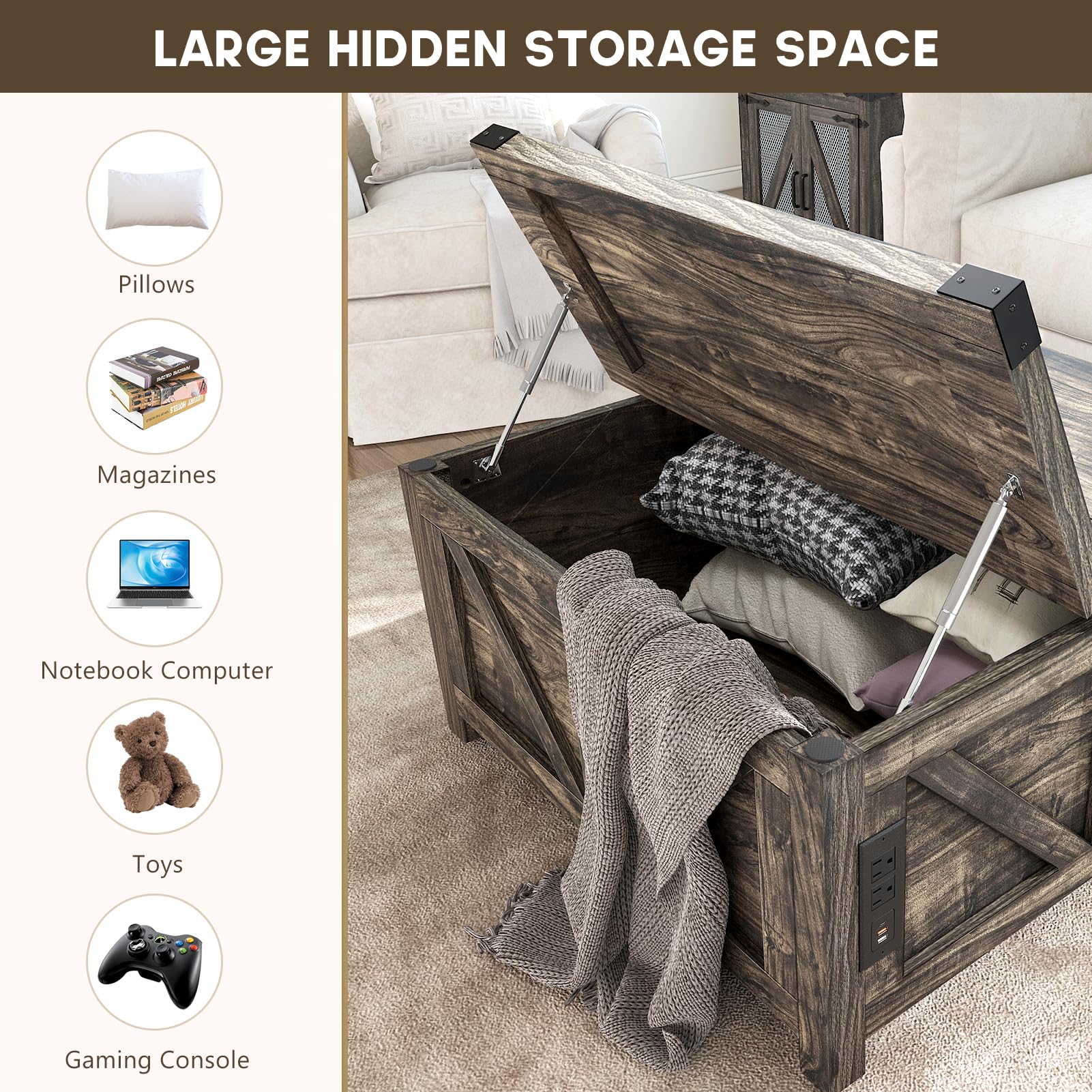 Farmhouse Lift Top Coffee Table with Storage and Charging Station – Dark Grey Wood Square Center Table with USB Ports, Hidden Compartment, and Spacious Storage for Living Room, Bedroom, or Home Office