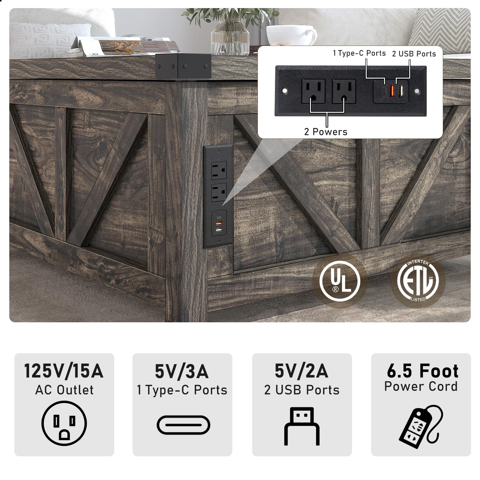- Convenient Design: The grey wooden coffee table experiences smooth and safe lifting with a premium lifting mechanism featuring gas struts. It can be lifted to a height of 23.6 inches from the ground for convenient office work. There are charging stations with 2 USB ports, 1 Type-C port and 2 output ports on the side convenient for phone charging or using the notebook.