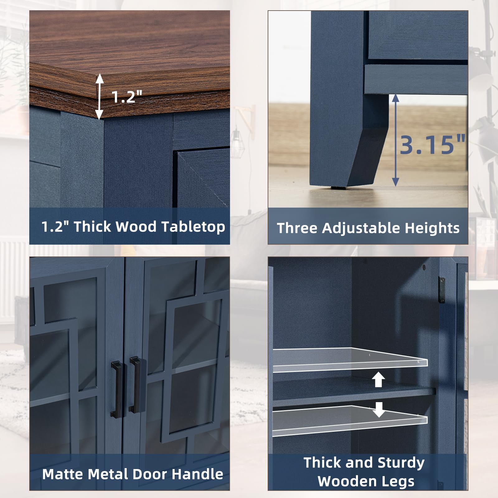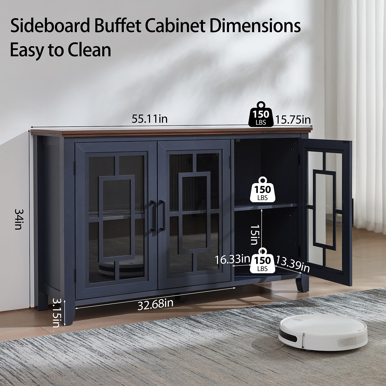 **55" Large Farmhouse Sideboard Buffet Cabinet with Storage, Wood Coffee & Wine Bar Cabinet with 3 Glass Doors, Mid-Century Modern Sideboard for Dining Room or Living Room, Navy Blue**