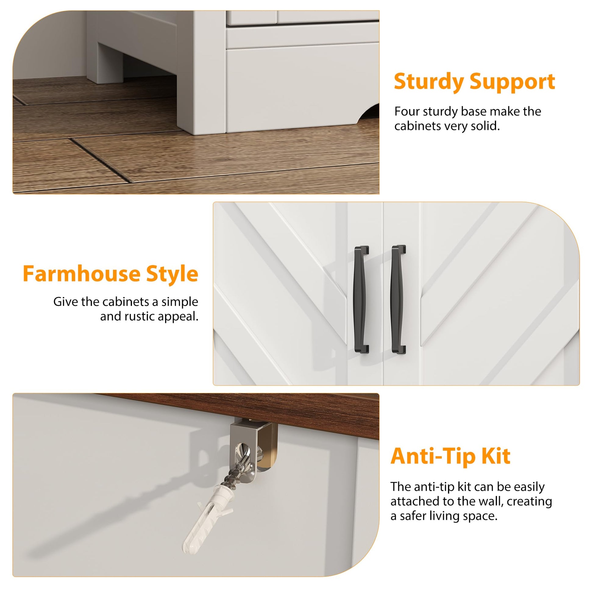 - Large Kitchen Storage Cabinet -The buffet cabinet showcases a wide tabletop, perfect for placing your coffee maker and microwave oven, while Three open storage spaces and the four-door cabinet can easily accommodate all your daily kitchen utensils. The shelf inside is 3-level adjustable to meet various storage needs.