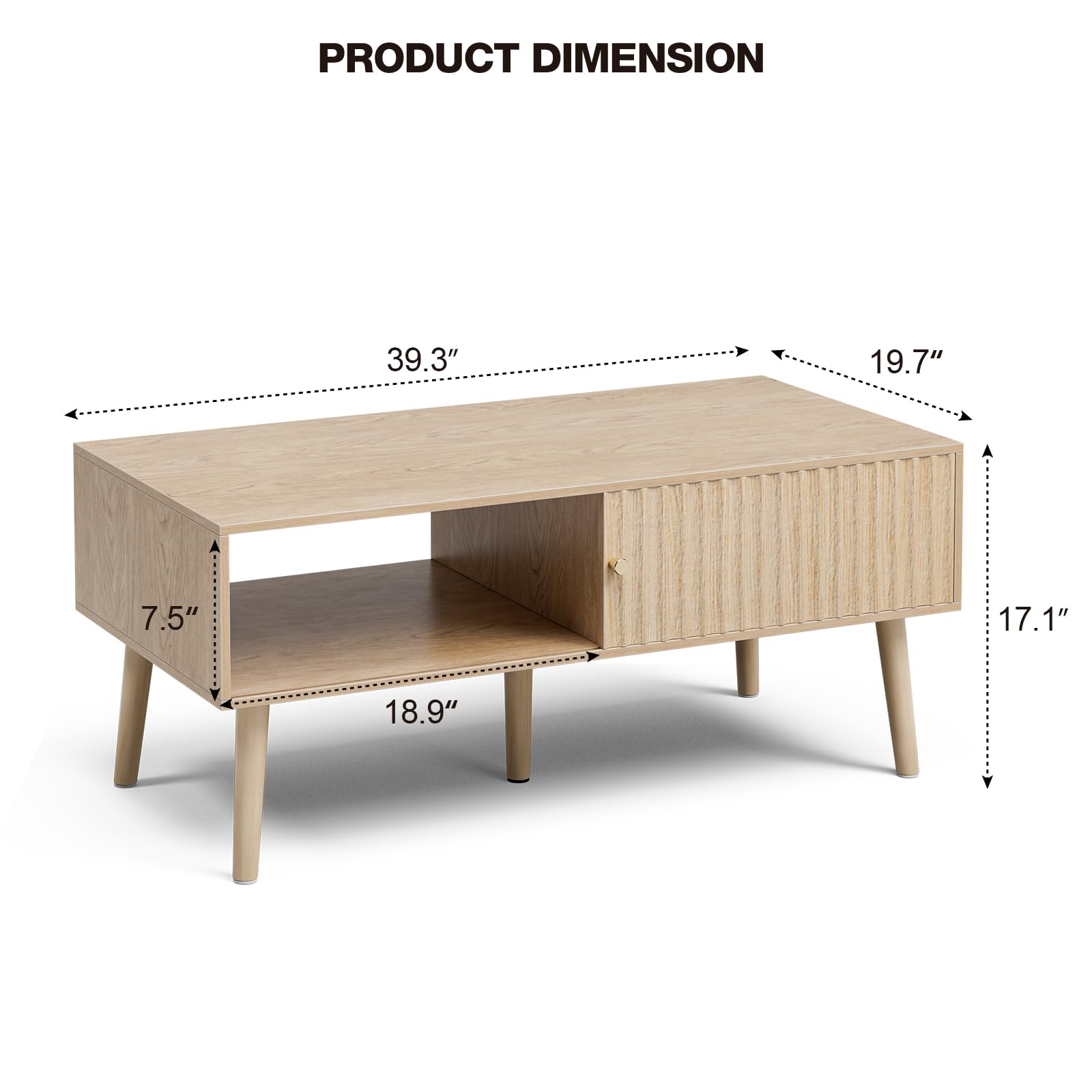 Boho Coffee Table with Storage – Sliding Fluted Door & Solid Wood Legs, Small Center Table for Living Room, Oak