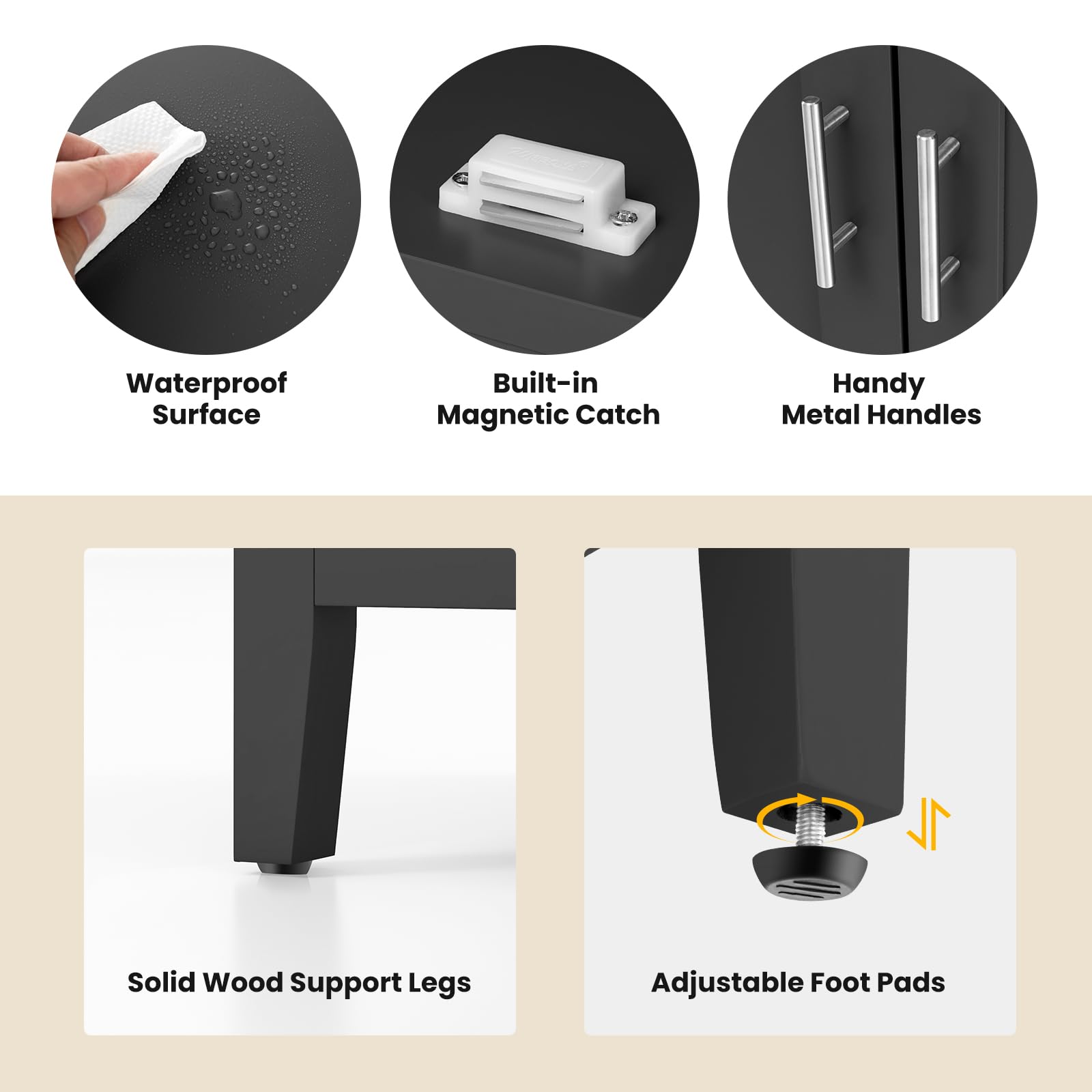 - -Considerate Details- 1. Adjustable Shelf: The middle shelf inside the storage cabinet could be freely adjusted in order to accommodate items with different heights. (Five positions to set) And you could also leave it aside if you don’t want to use it. 2. Pine Wood Legs with Footpads: The footpads will avoid direct touch from the legs to the floor in order to protect your floor from scratches. 3. Waterproof Surface: Treated with waterproof painting, it’s easy for you to keep it clean.