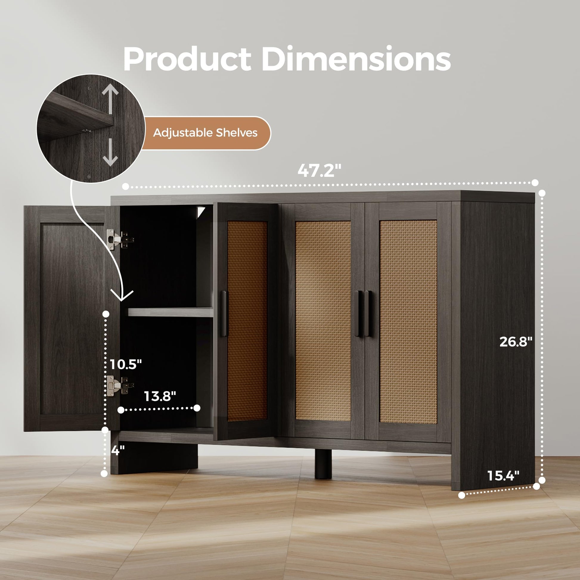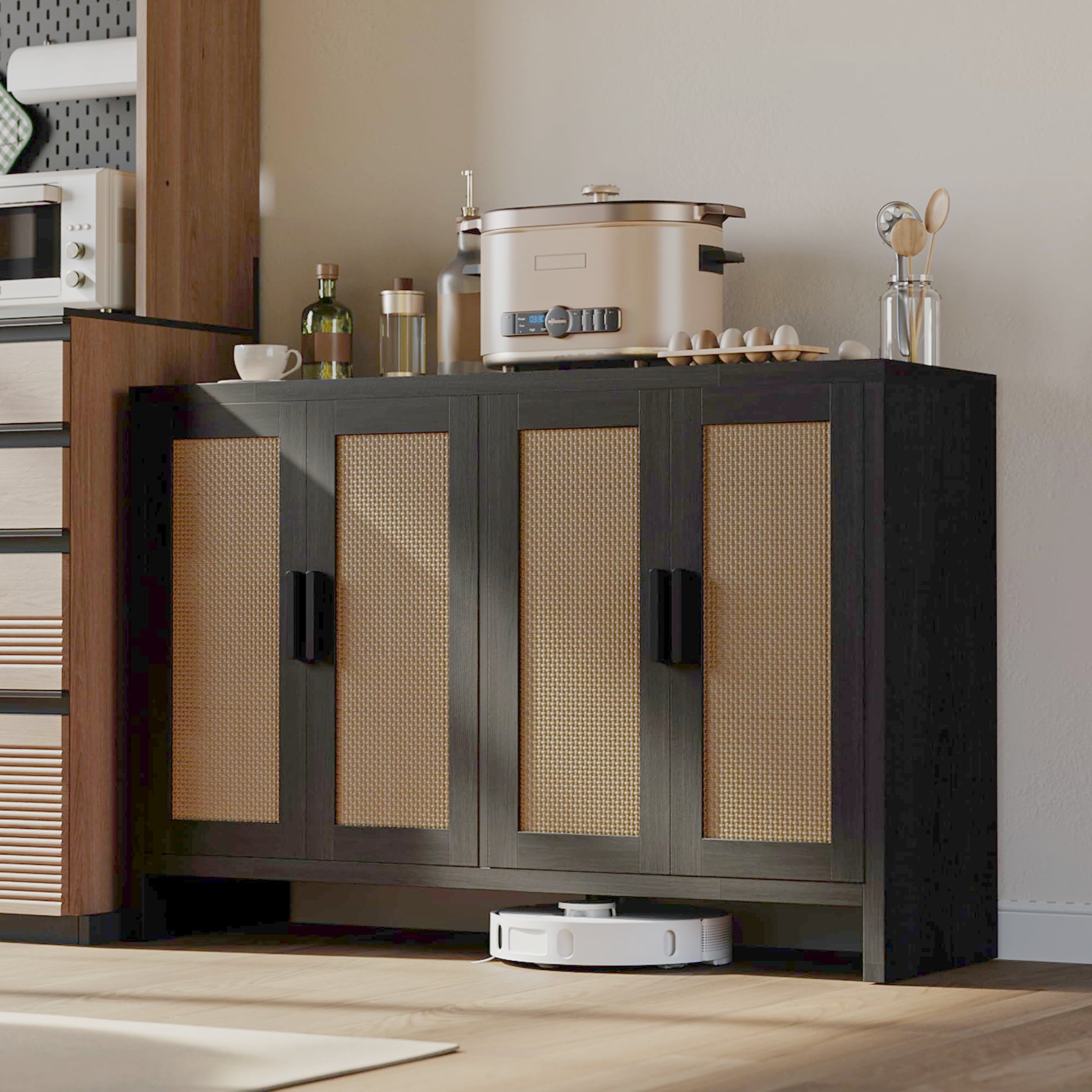 **Rattan Buffet Cabinet with Storage, Sideboard with Doors, TV Stand, Farmhouse Coffee Bar, Modern Wood Storage Cabinet for Living Room, Kitchen, or Dining Room, Black**