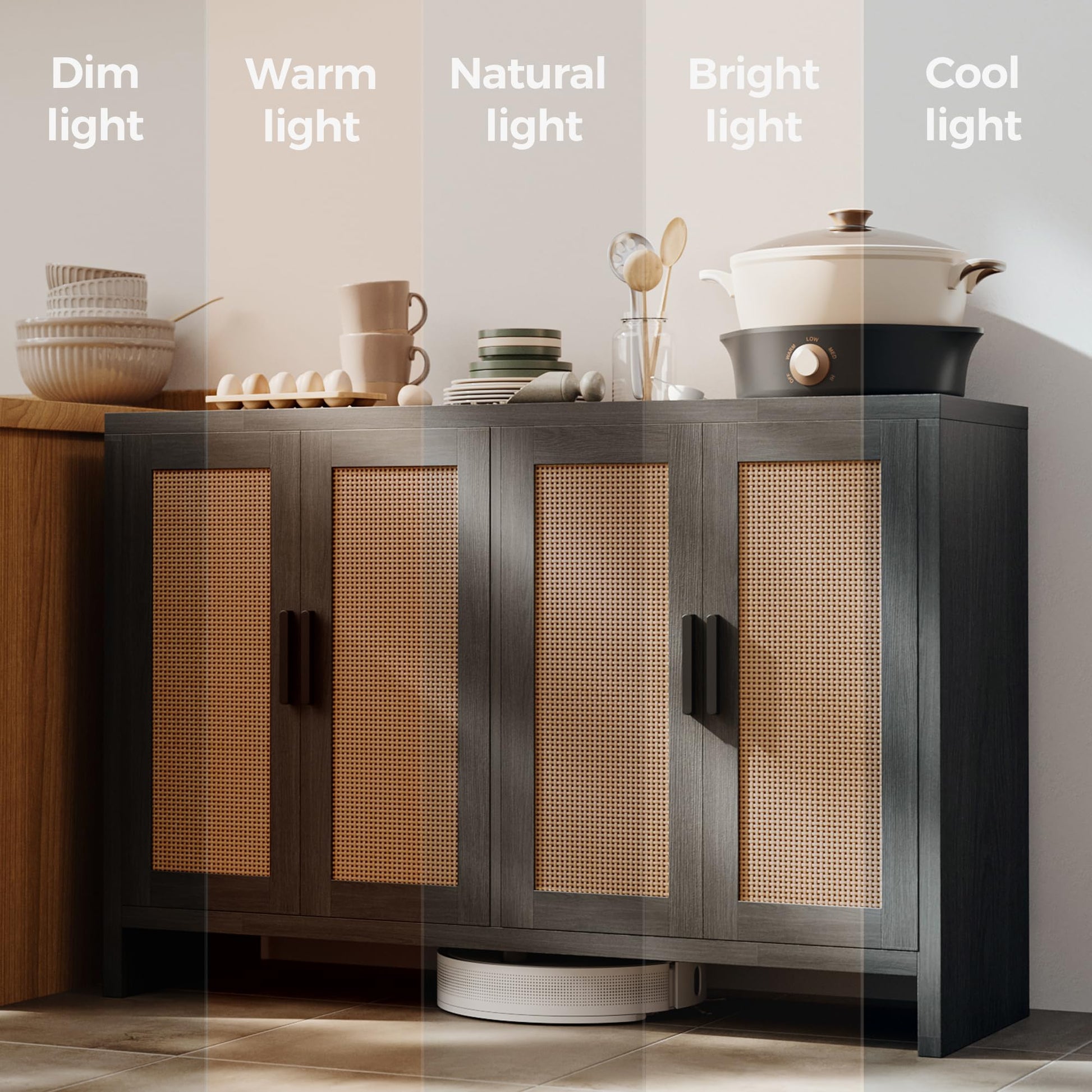 - 【Bohemian design】 This credenza storage cabinet is equipped with 4 design rattan wood doors, kitchen sideboard with black metal handles, adding a unique sense of fashion and charm to the product. The spacious top countertop can be used as a cooking table or to store tableware, etc., keeping the kitchen clean and tidy.