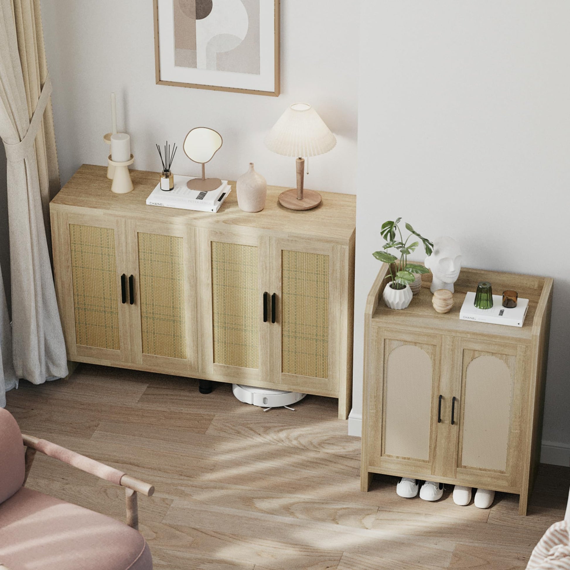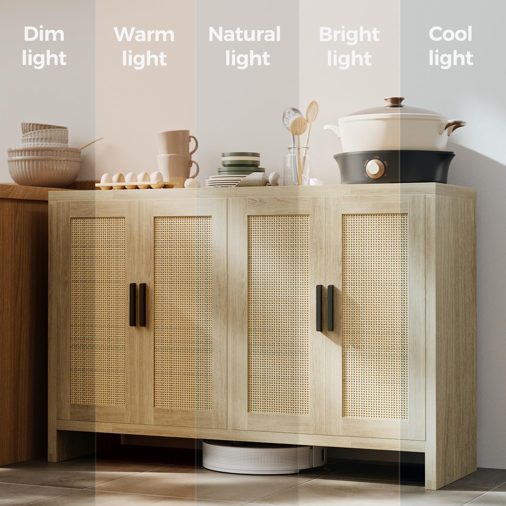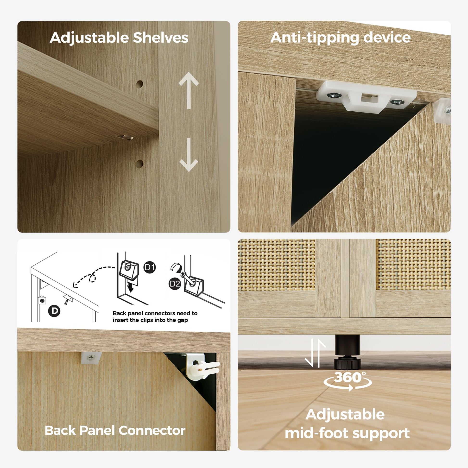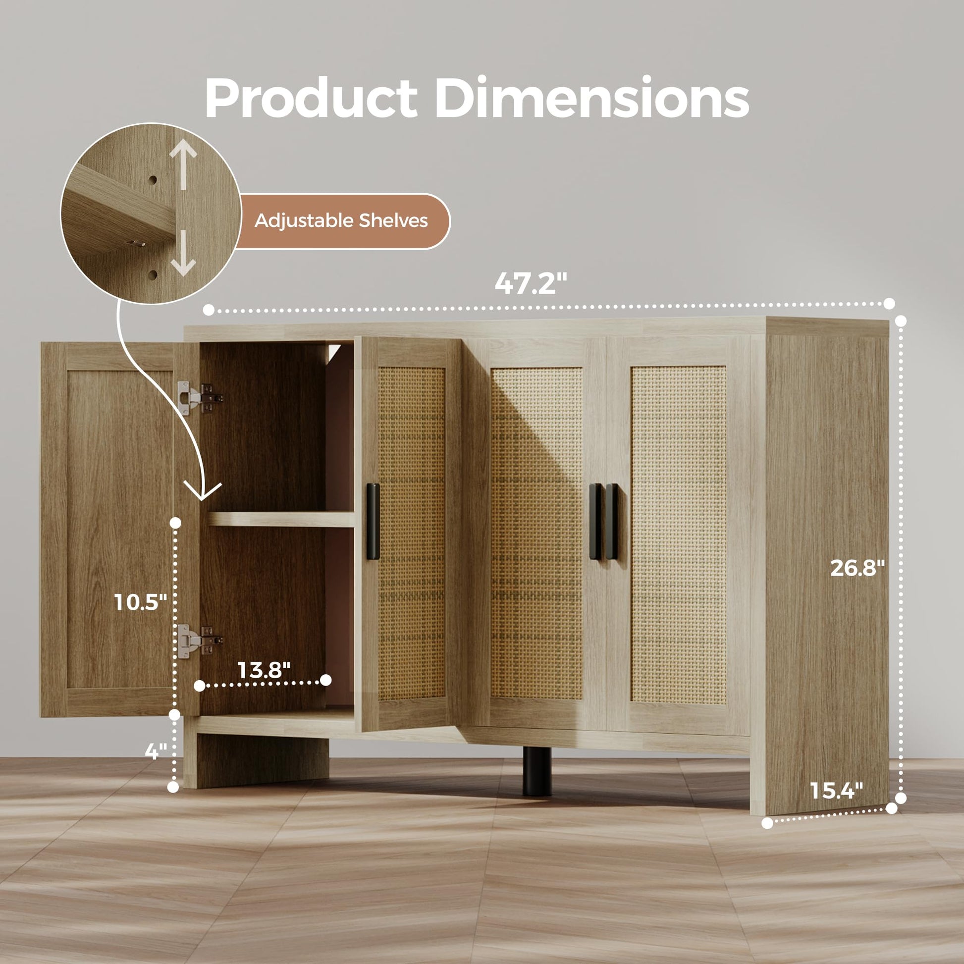 - 【Bohemian design】 This credenza storage cabinet is equipped with 4 design rattan wood doors, kitchen sideboard with black metal handles, adding a unique sense of fashion and charm to the product. The spacious top countertop can be used as a cooking table or to store tableware, etc., keeping the kitchen clean and tidy.