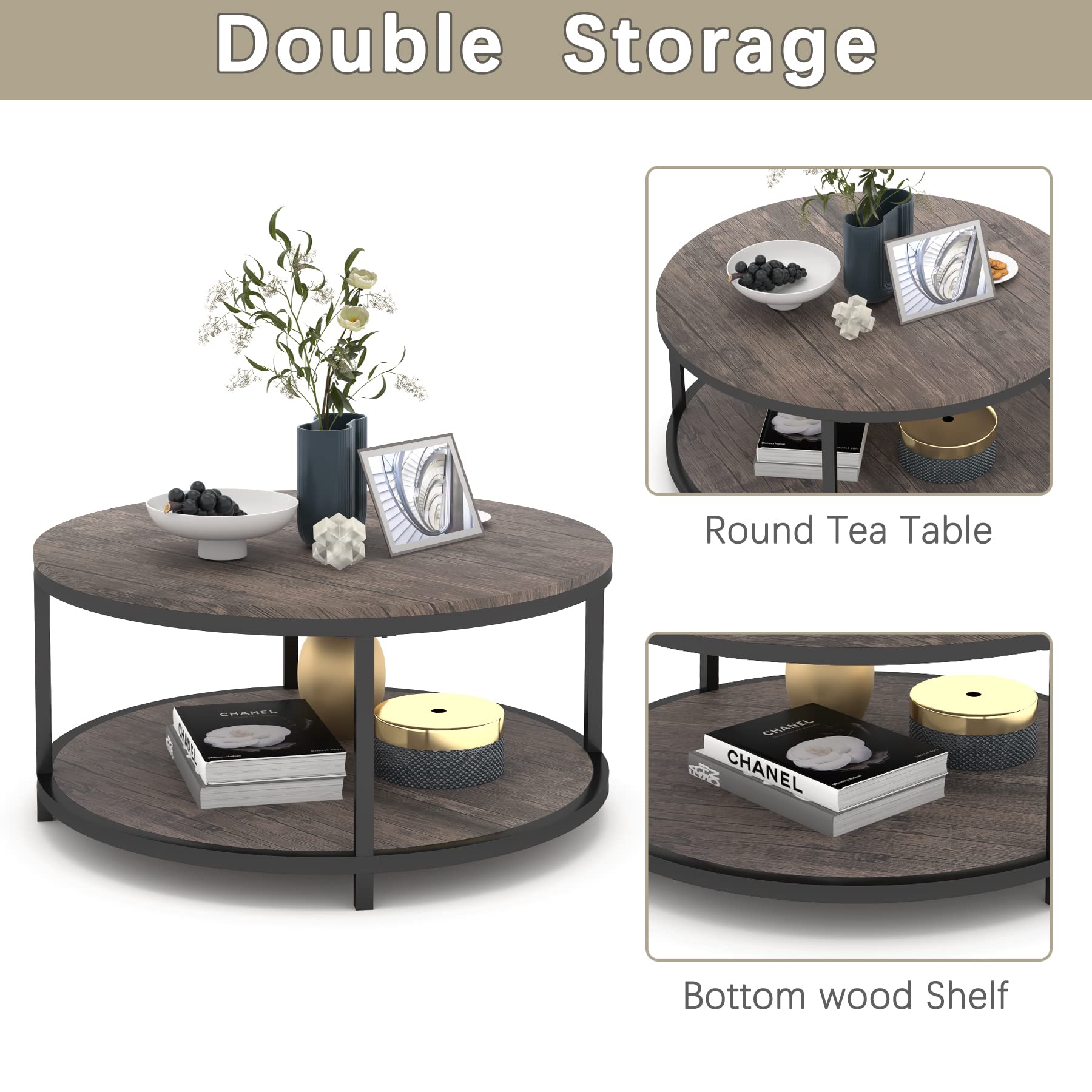 - [2-Tier Coffee Table] This coffee table boasts a spacious round top, measuring 36 inches in diameter, perfect for keeping your living room supplies organized and your daily essentials close at hand. The additional 33.5-inch bottom shelf provides ample storage space for magazines and toys, helping you maintain a neat and tidy living space.