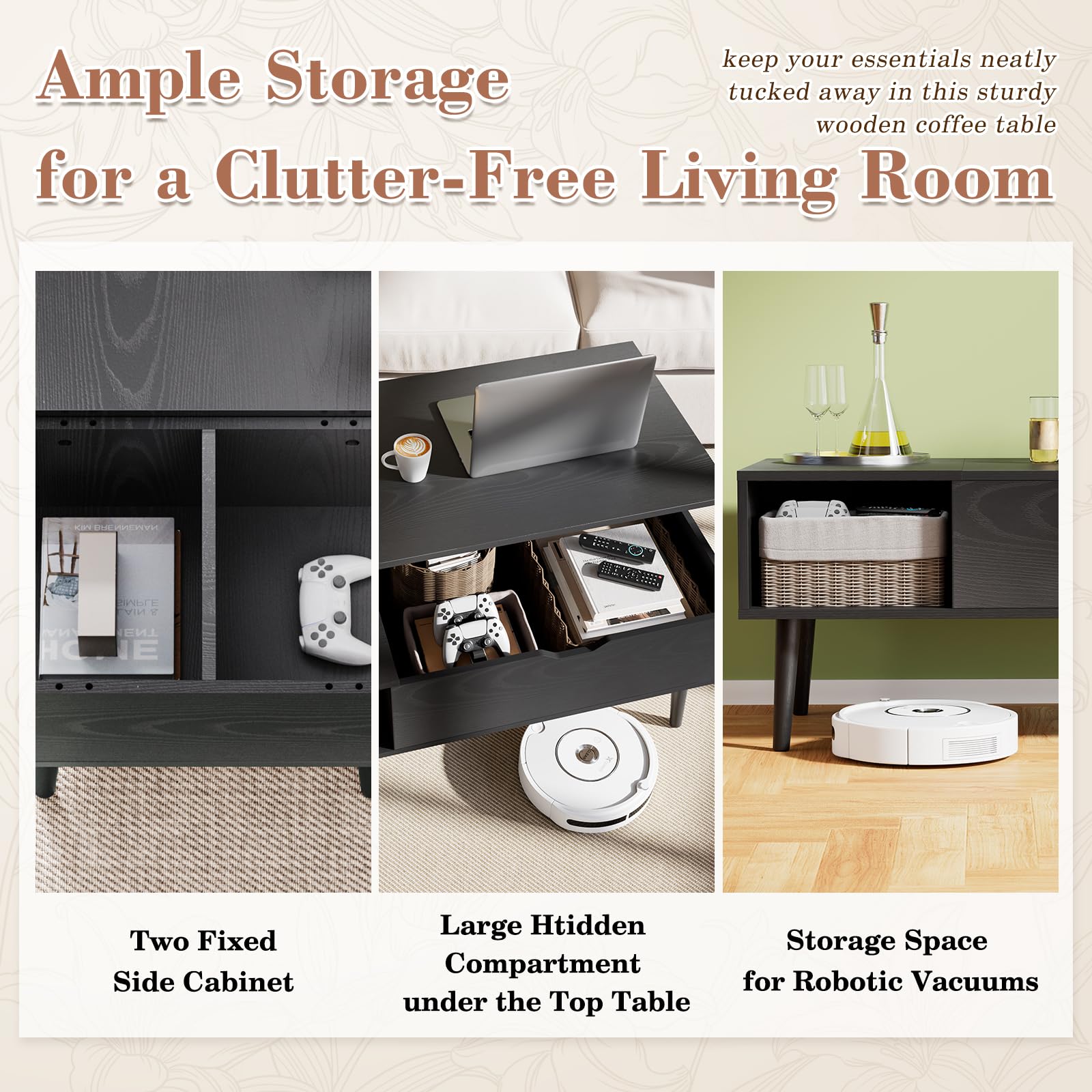 - 【Storage Space】There is a hidden storage space beneath the tabletop where you can place laptop, remote controls, cups and other daily items without getting dirty. The two shelves on the side of the coffee table with storage offer extra space to hold blankets, books, snacks and knick-knacks.