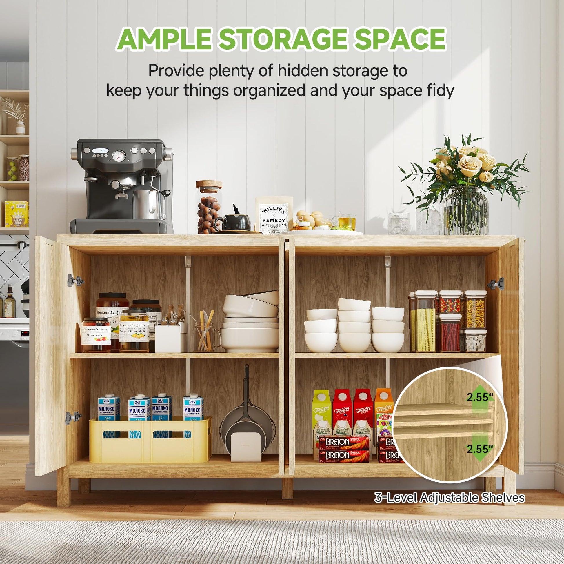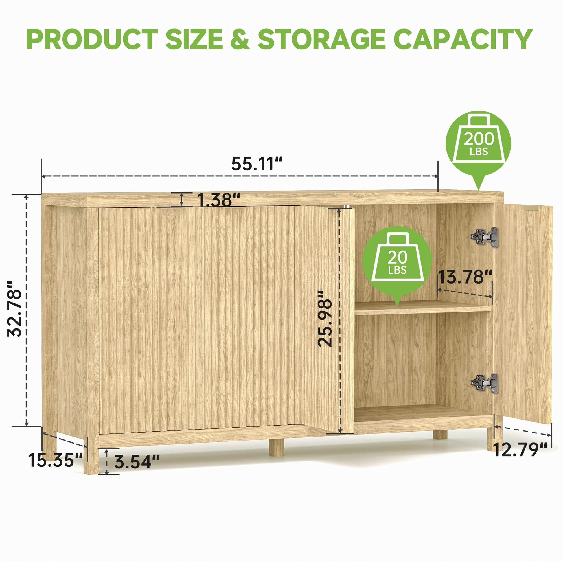 Real Relax Fluted Sideboard Buffet Cabinet with Storage, Modern 55" Credenza with 4 Doors, Adjustable Shelves, Large Coffee Bar Table for Dining Room, Kitchen, Living Room, Natural Oak
