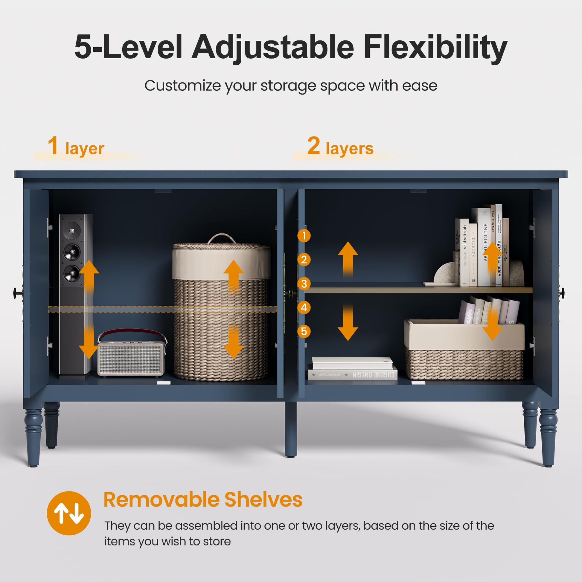 - 【Friendly Design】 The Adjustable Thickened shelves allow you to customize the height to suit your needs, making it easy to Heavy appliances, Larger items like books, coffee machine. Additionally, you can adjust the Hinge screws to fine-tune the door alignment for a seamless frame fit, while preventing rust. The cabinet's base provides a generous 5.5-inch clearance for Effortless Cleaning, and effortless access for sweepers