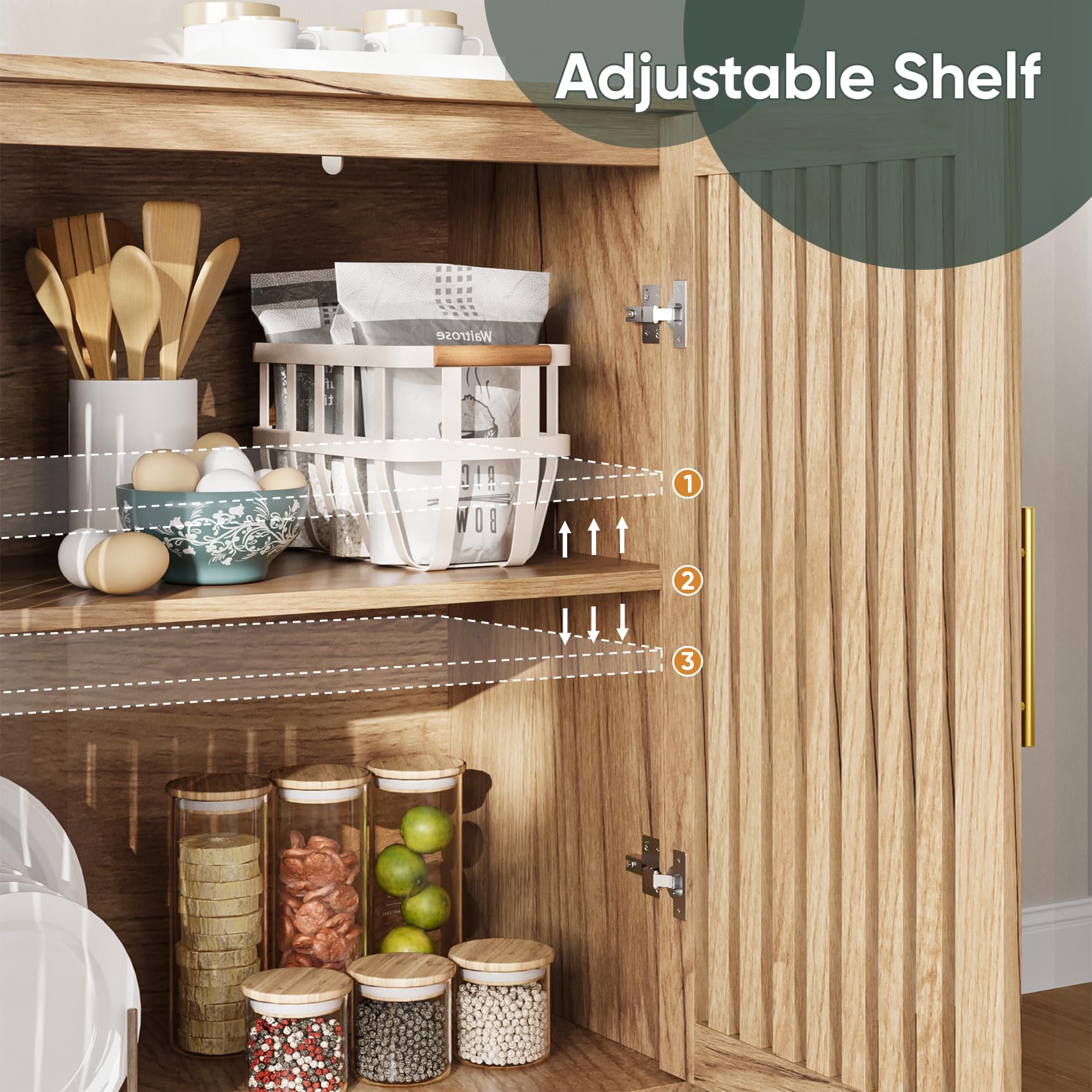 - 【Spacious Storage with Adjustable Cabinets】The Sideboard buffet cabinet is equipped with two doors, allowing you to easily rearrange their positions to suit your warm home. It offers four spacious compartments with adjustable shelves, perfect for storing coffee beans, spices, and miscellaneous items. The generous tabletop provides an ideal spot for your microwave, toaster, and coffee maker