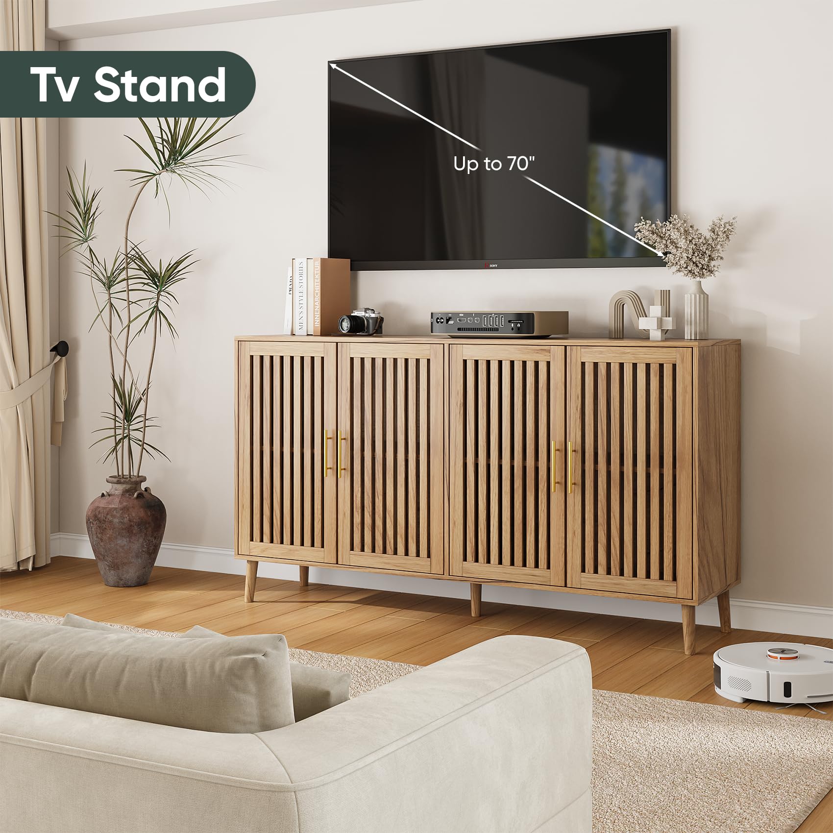 63" Sideboard Buffet with 4 Louvered Doors and Gold Handles, Farmhouse Coffee Bar Storage Cabinet for Entryway, Kitchen, Dining, or Living Room, Walnut