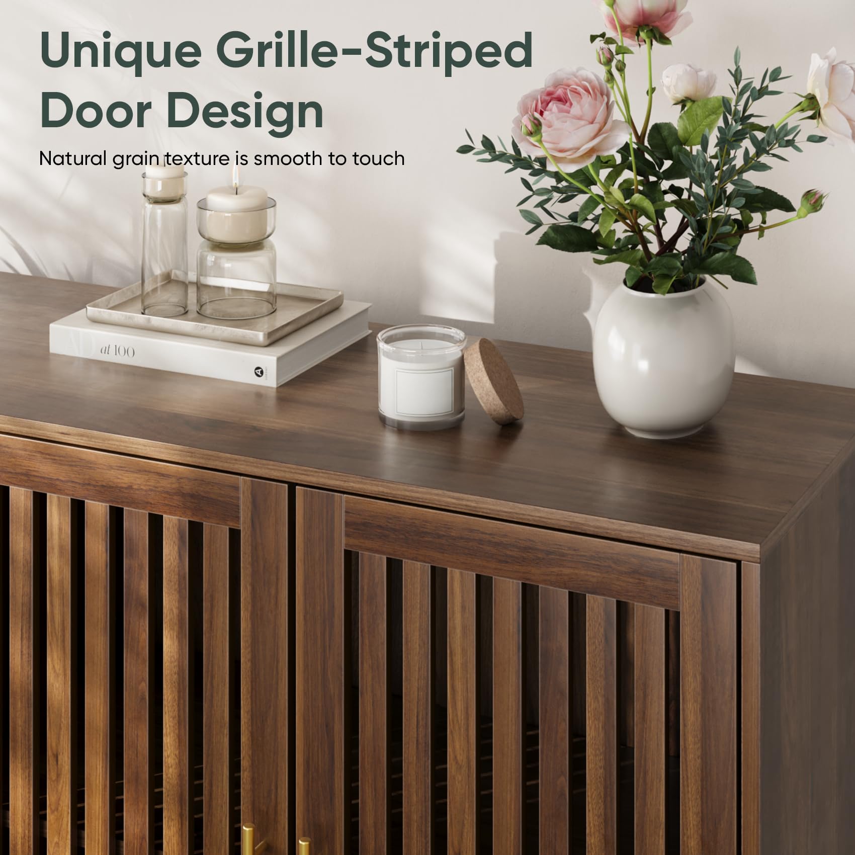 - 【Modern Farmhouse Storage Cabinet】This walnut storage cabinet features unique slatted doors, beautifully combining rustic charm with modern elegance. Its eye-catching design will add a striking touch to almost any room