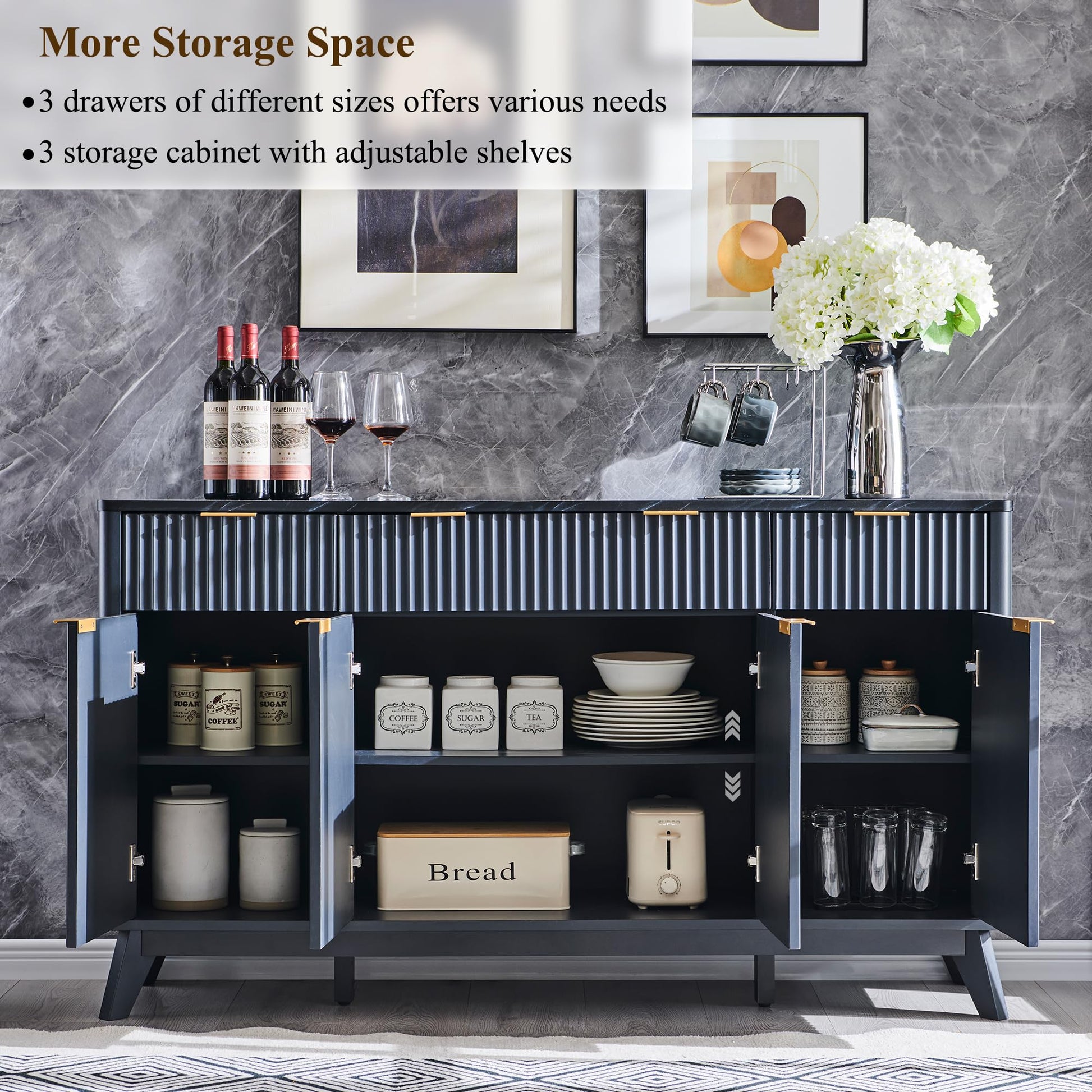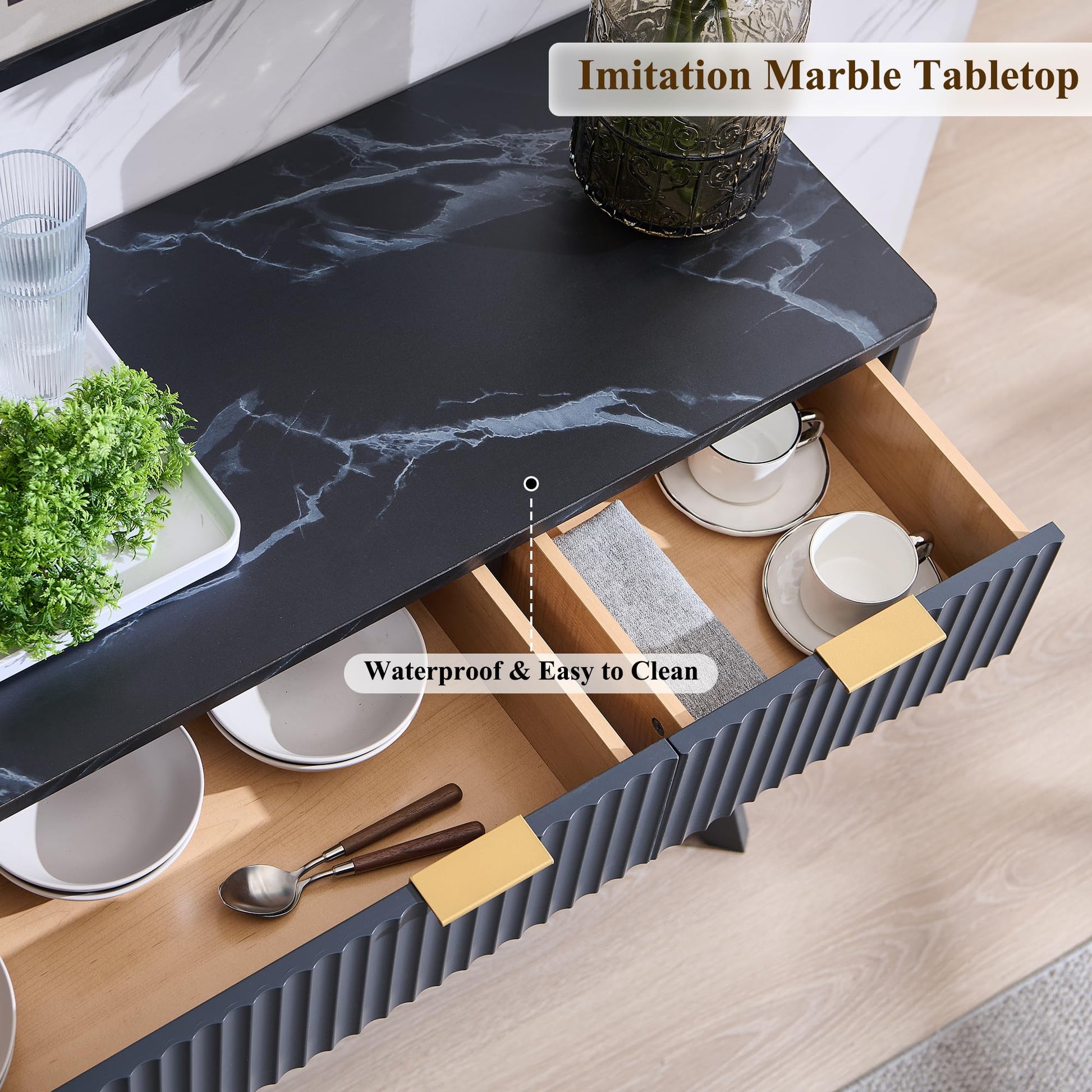 - Morden Fluted Elegant Look: This 60-inch buffet cabinet features a The unique wave-shaped grooved panels and curved silhouette effortlessly complement modern furniture. Available in dark grey marble-inspired patterns, they replicate the elegance of natural stone while maintaining a lighter weight. Its minimalist aesthetic adds a touch of sophistication to any dining area, living room, or hallway.