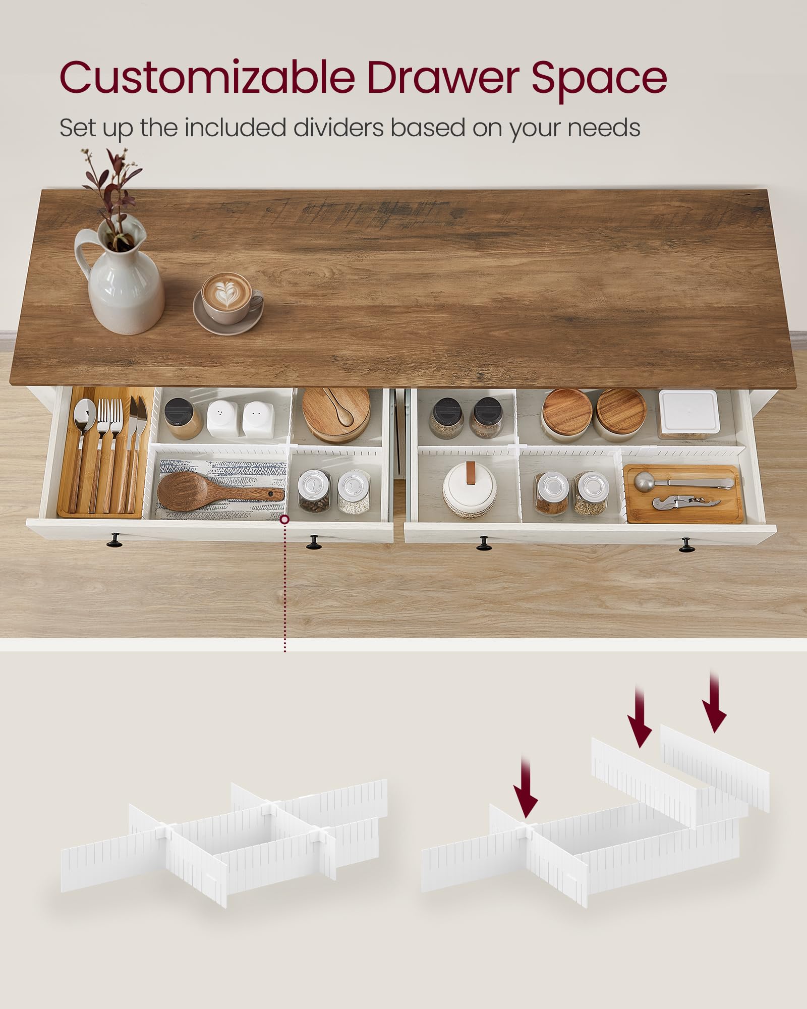 - Customizable Design: This buffet cabinet comes with adaptable drawer dividers to let you organize the drawer space as you need. Each bottom cabinet features an adjustable shelf with 5 height options, allowing you to store items of different sizes
