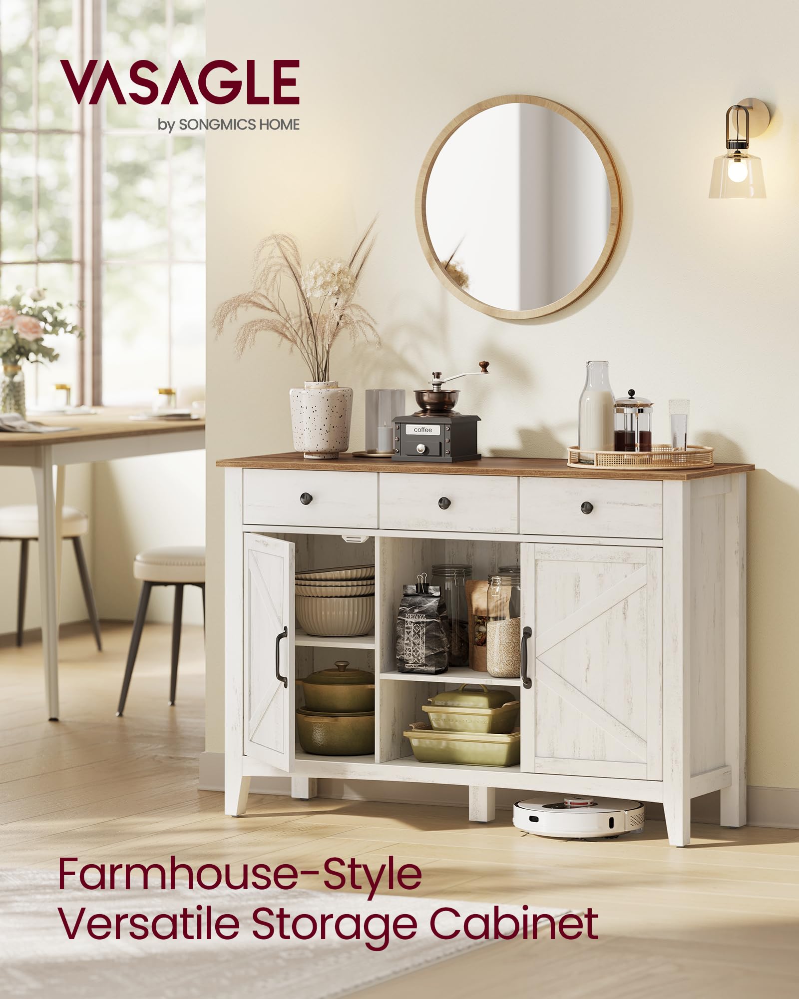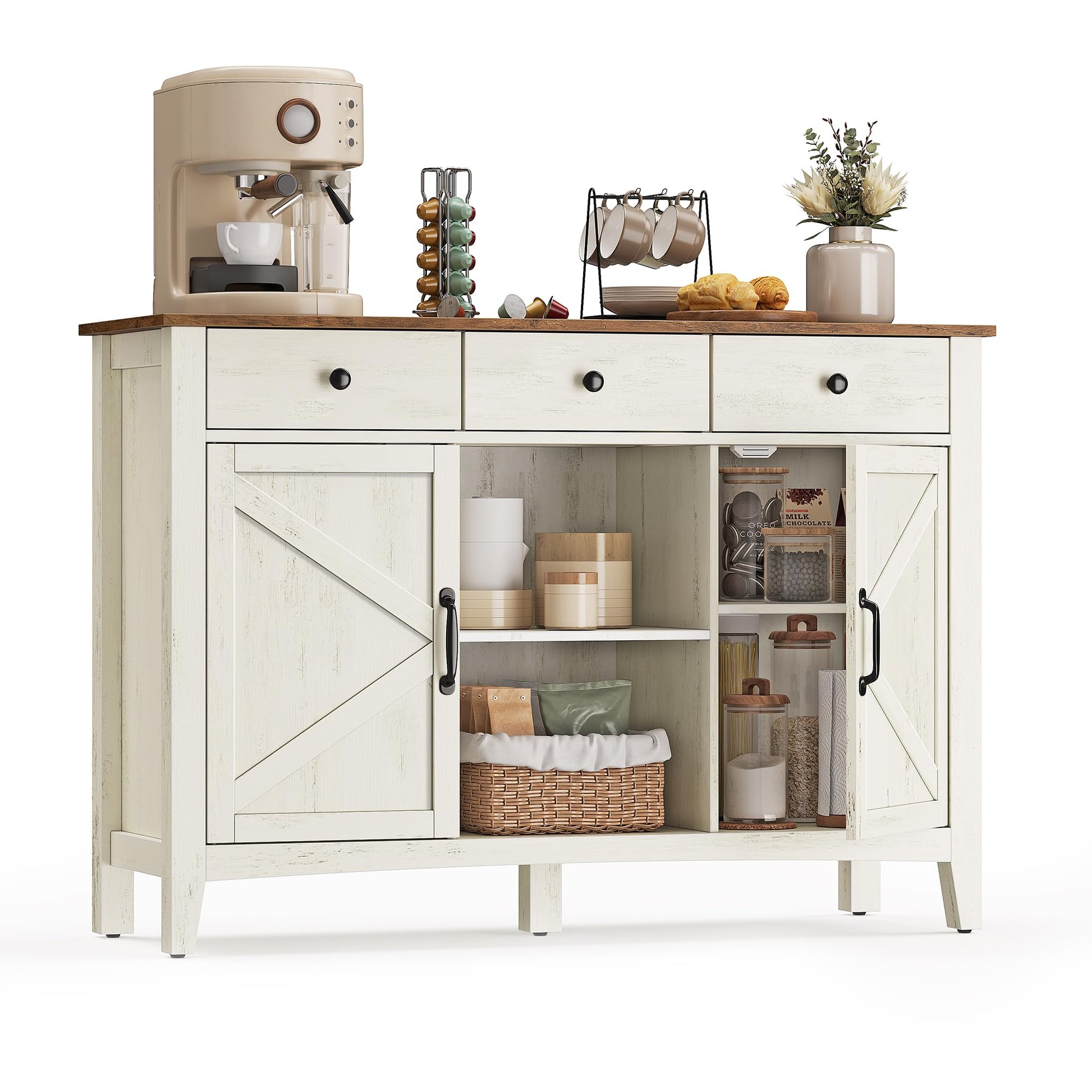 **Buffet Cabinet, Coffee Bar Cabinet with 3 Drawers, Adjustable Shelves, Sideboard Storage with Cable Holes and Drawer Dividers, Rustic White and Honey Brown**