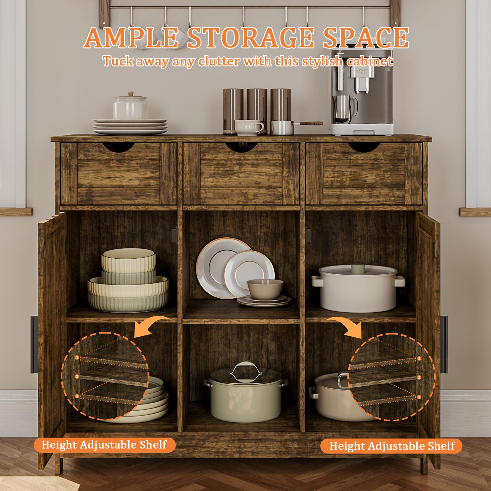 Storage Cabinet with 2 Doors, 3 Drawers, and 2 Adjustable Shelves, Coffee Bar Sideboard for Bathroom, Kitchen, or Living Room, Retro