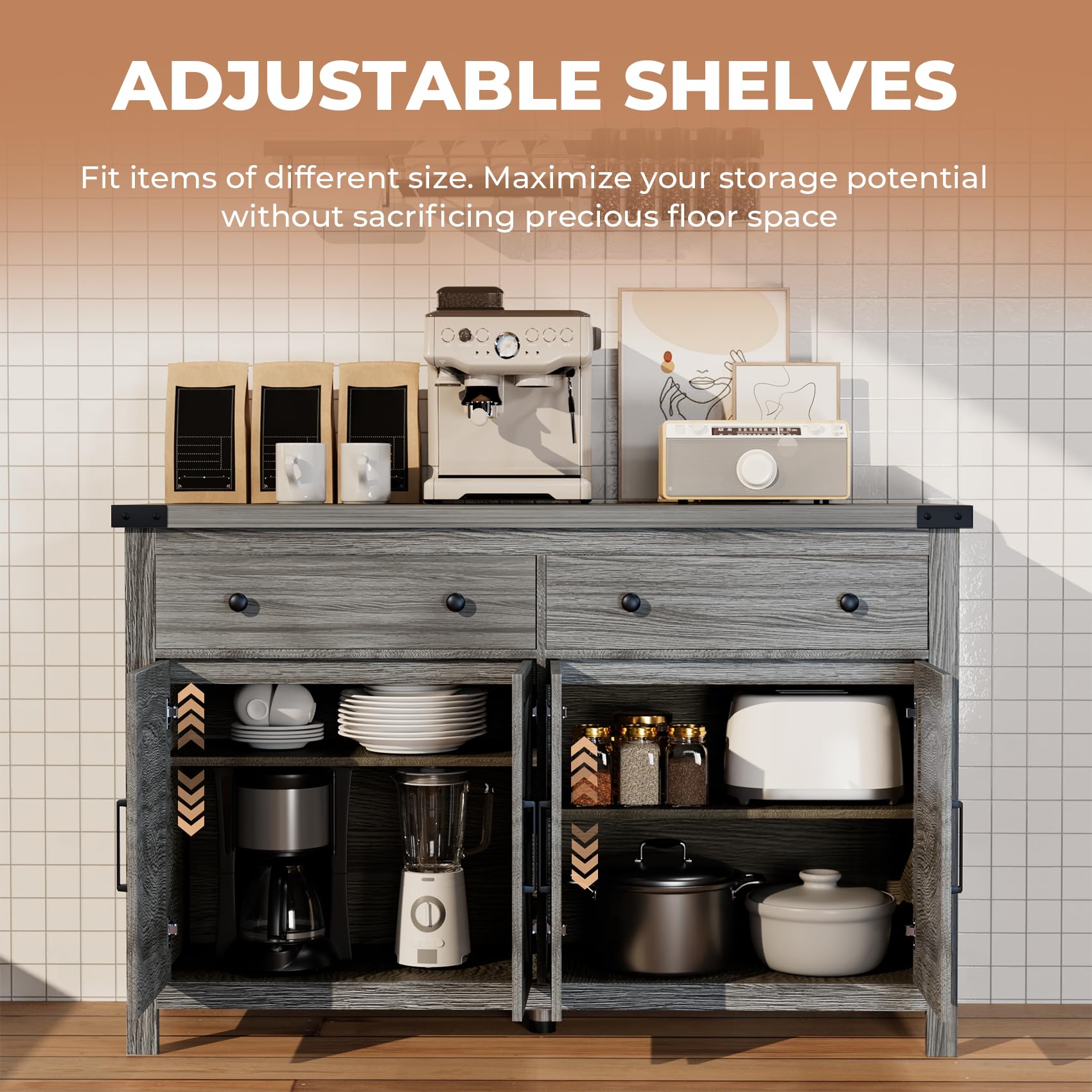 - 【Large Divided Storage】Say goodbye to clutter. The spacious countertop can accommodate coffee makers or microwave ovens. The adjustable shelves with doors allow you to personalize the height of shelves, no longer worrying about "too tall to put in". The drawers of the coffee bar cabinet make your essentials close to hand.Convenient sideboard buffet cabinet.