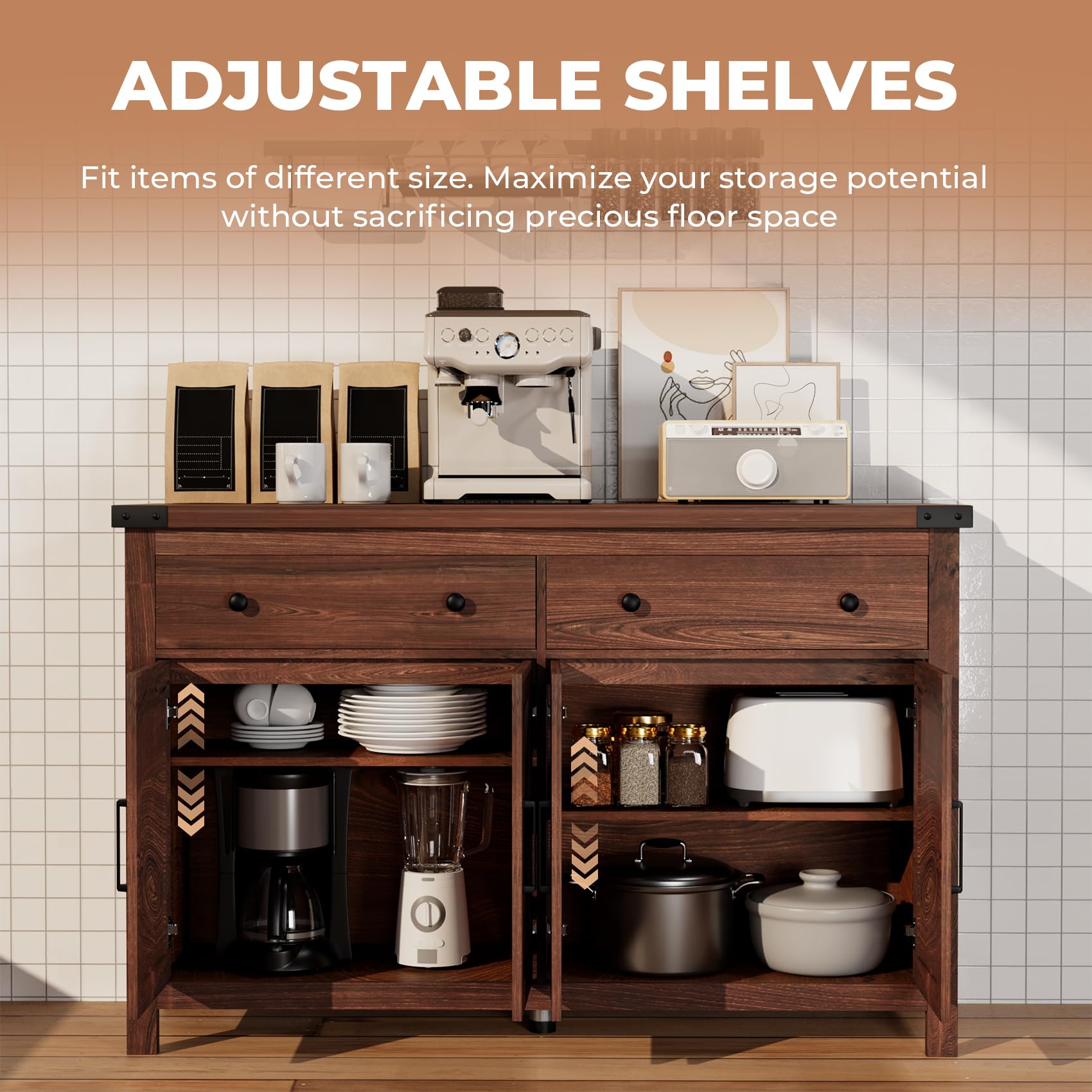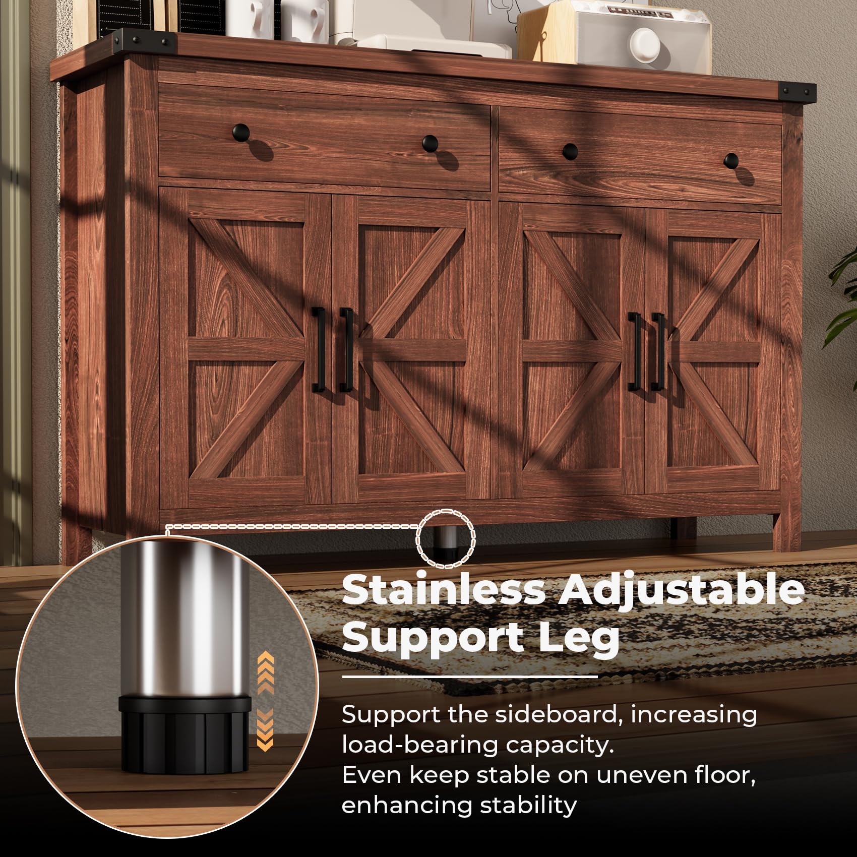 • 【Better Wood】Thicker and Denser Wood. The coffee bar cabinet with 2 drawers and 4 barn doors is made from thicker MDF wood.The material with higher density is sturdier and smoother, largely reducing the likelihood of scratching, peeling and cracking.