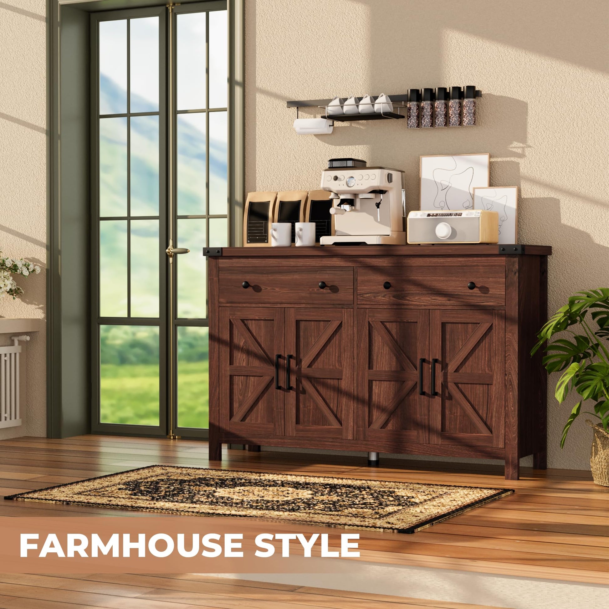 55'' Farmhouse Buffet Cabinet with Storage, Cherry Wood Sideboard Coffee Bar Cabinet with 4 Doors & 2 Drawers, Large Kitchen Storage Cabinet for Dining Room & Living Room