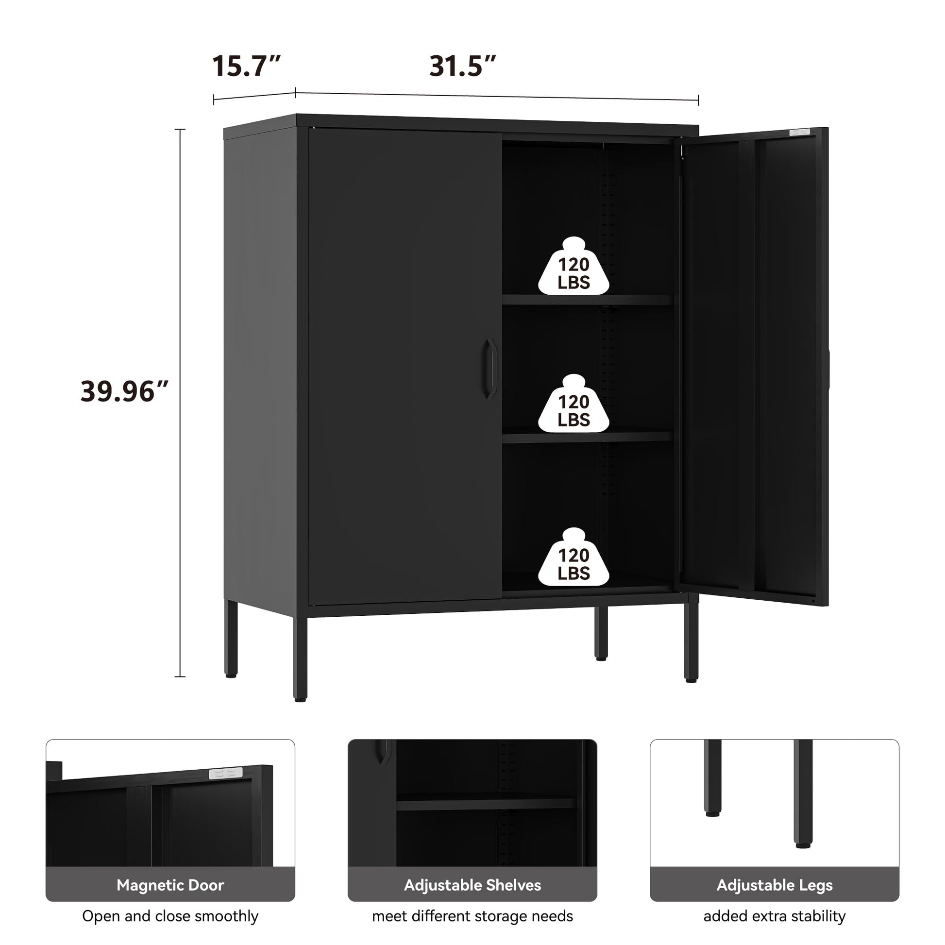 Metal Locker Storage Cabinet with 2 Doors and 4 Shelves, 39.96" Steel Floor Cabinet for Office, Home, Garage, Gym, or School, Black